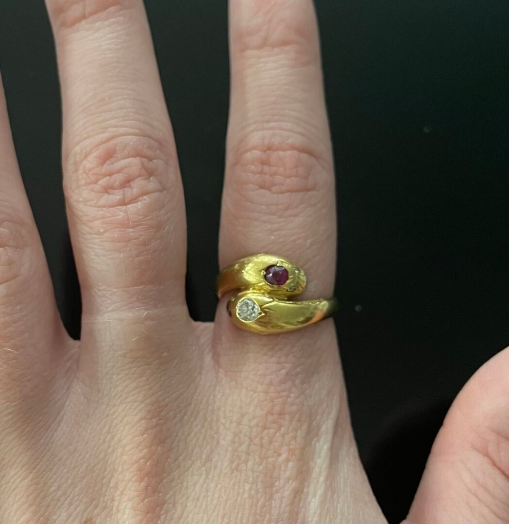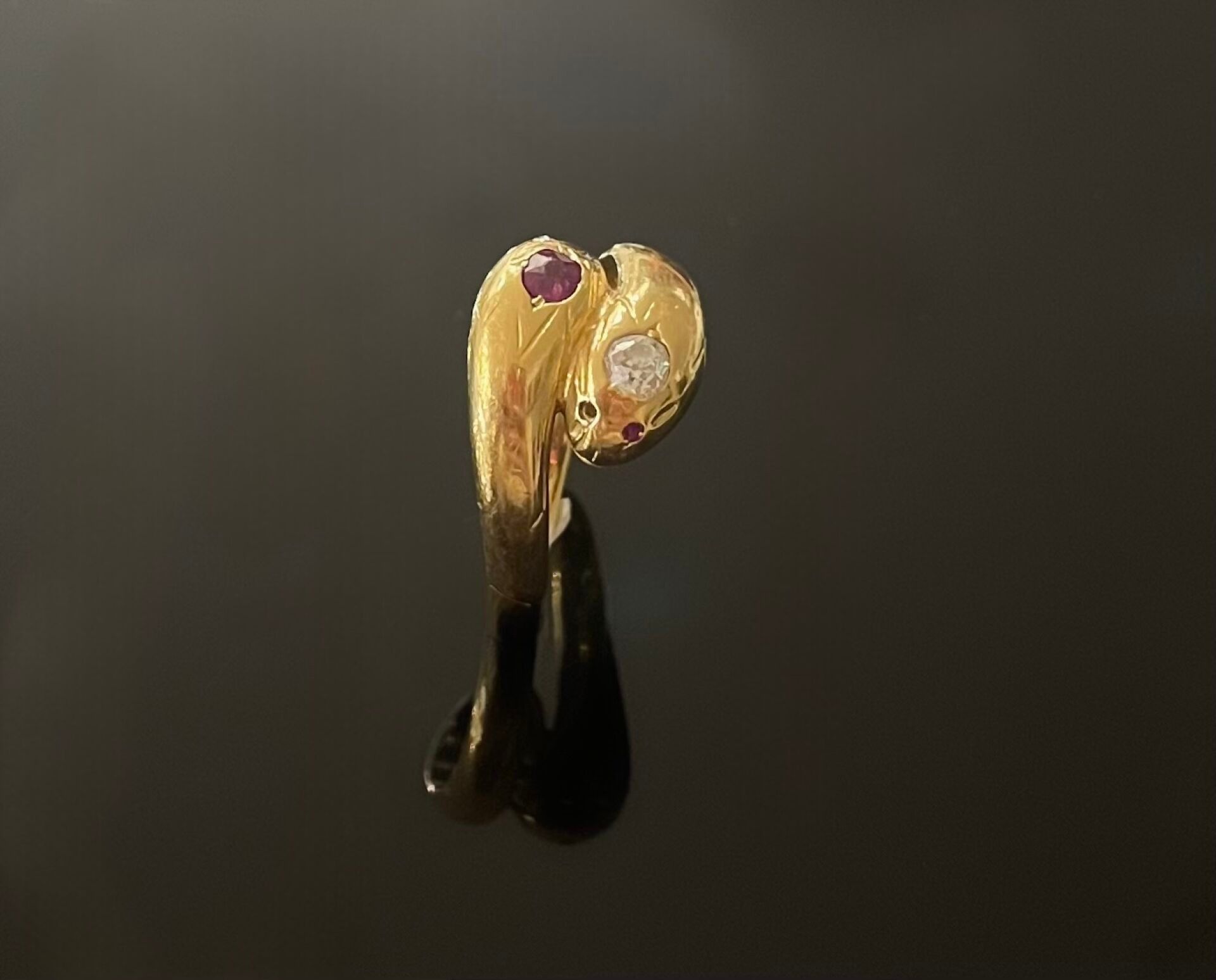 Snake ring in yellow gold (750) set with a brilliant and red…