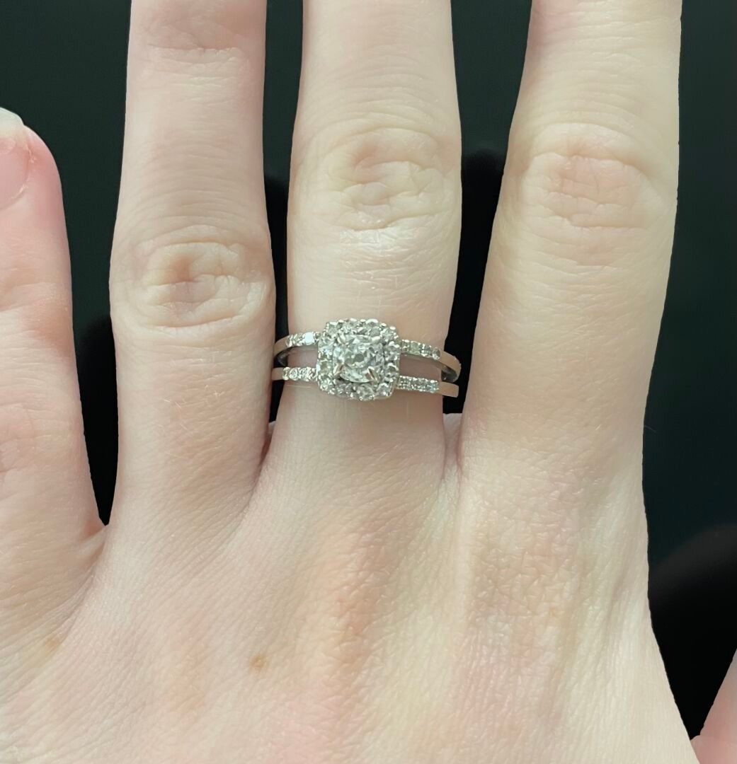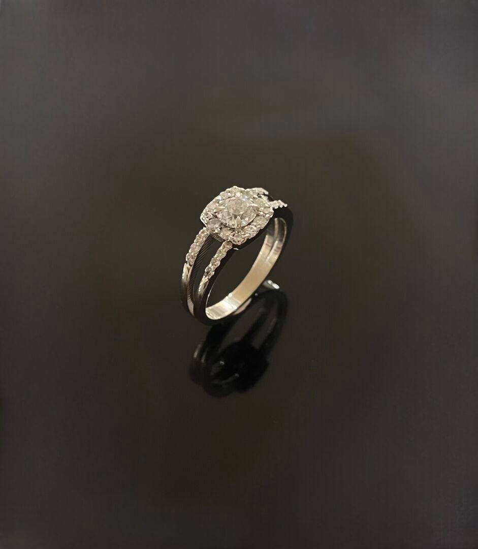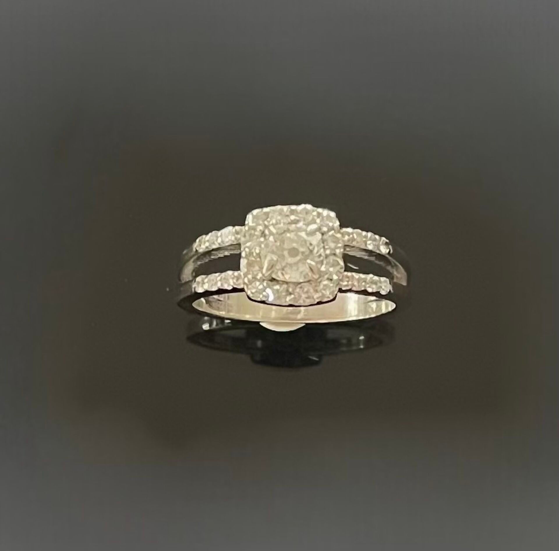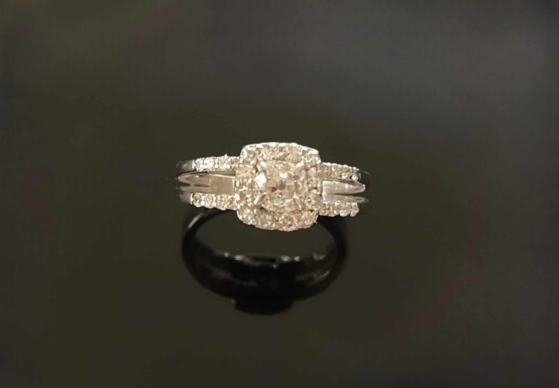 Ring in white gold (750) set with a central diamond weighing approximately 0.30 ct in a claw setting, surrounded by small diamonds and also set on the shoulders.