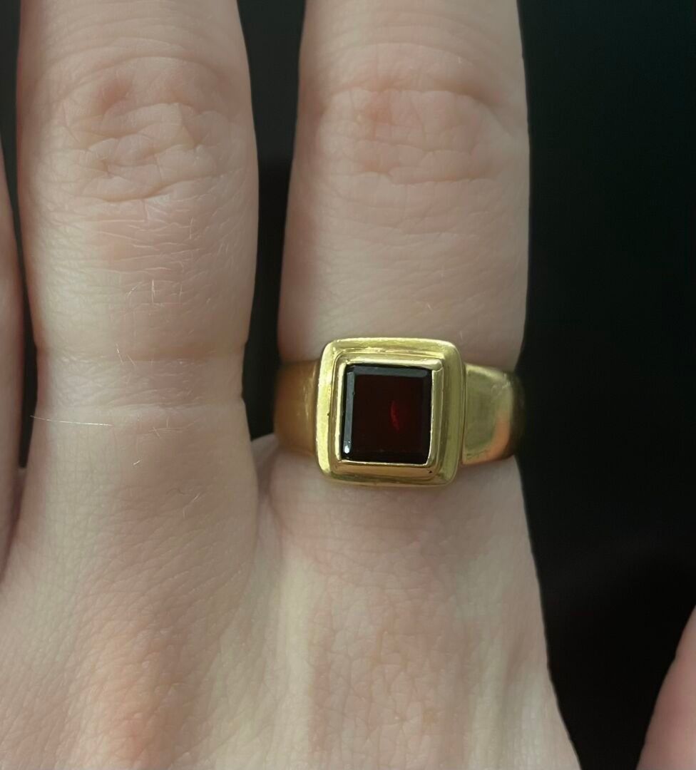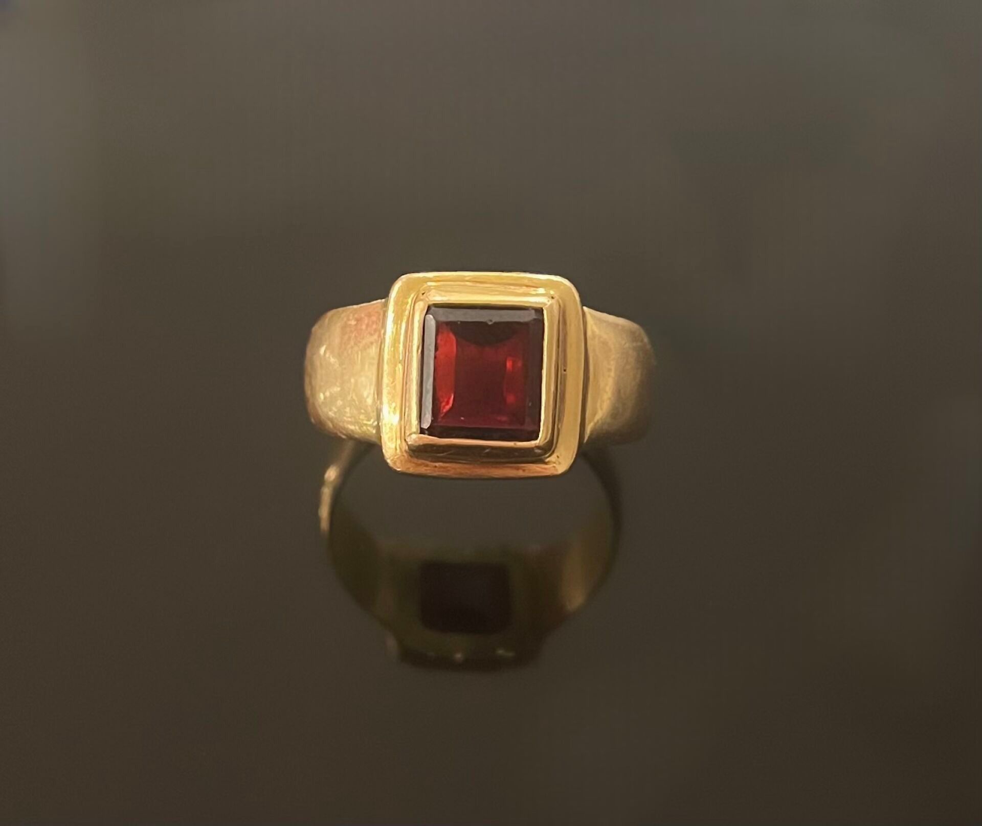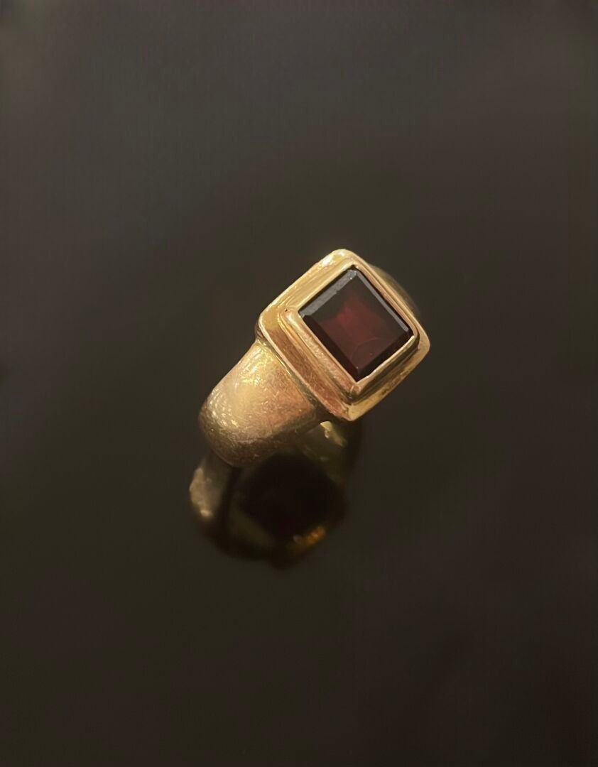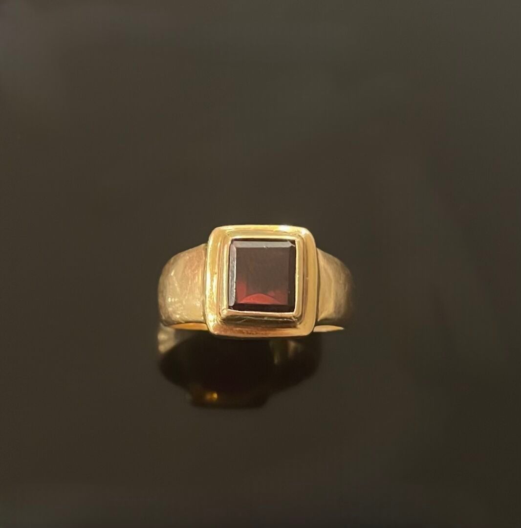 Yellow gold signet ring (750) set with a square red stone Finger: 56 - Gross weight: 6 g (10€ to be paid by the buyer)