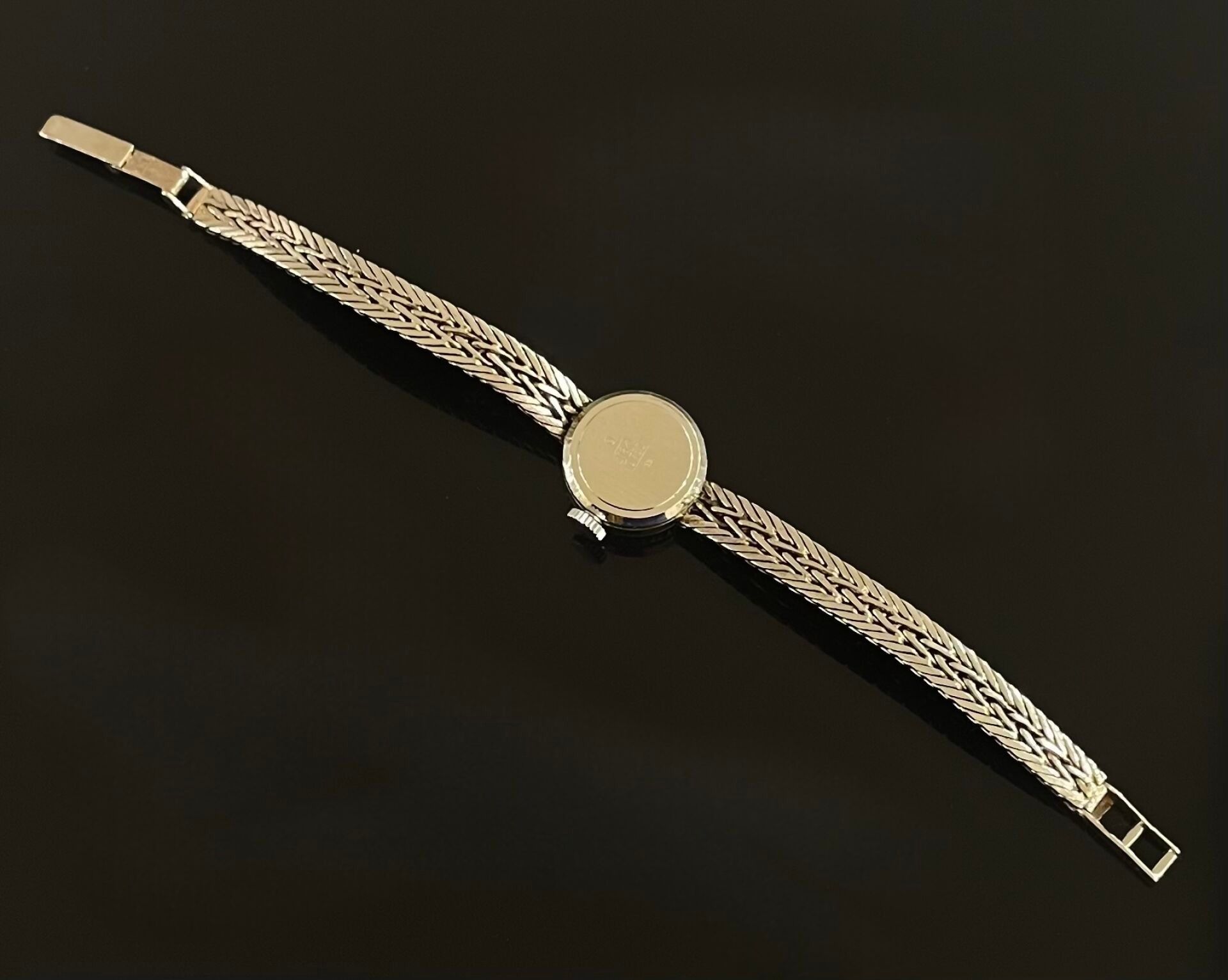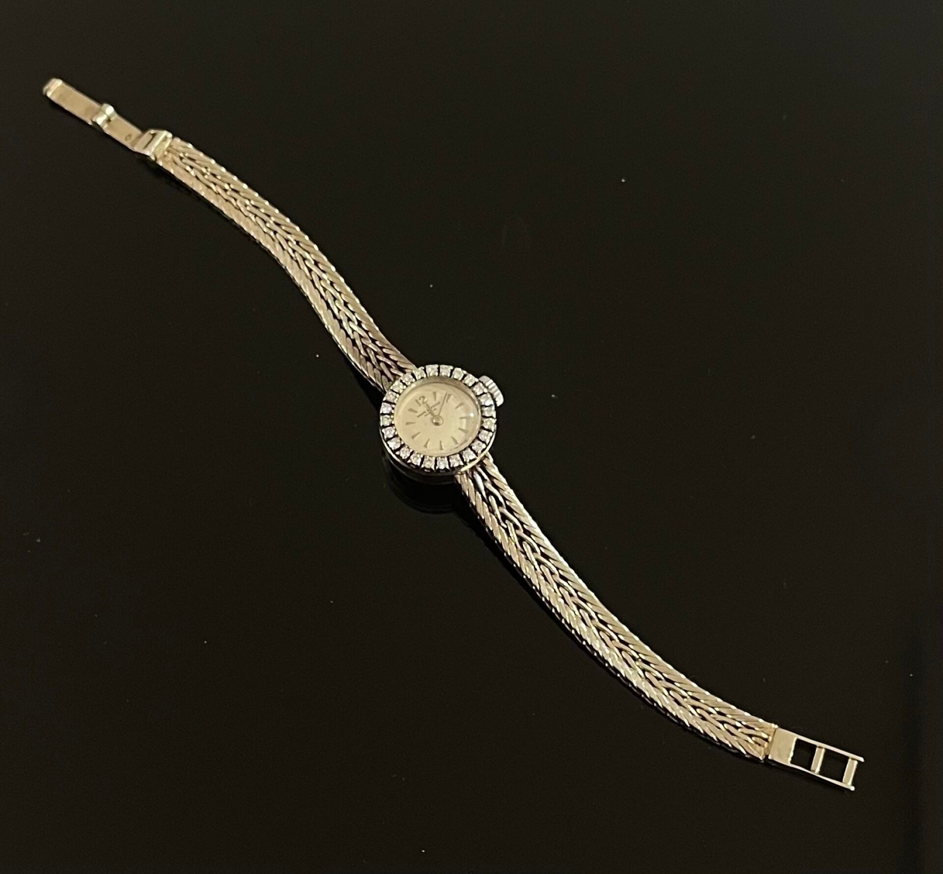 Lady's wristwatch in white gold (750). Round dial set with small diamonds. Mechanical movement