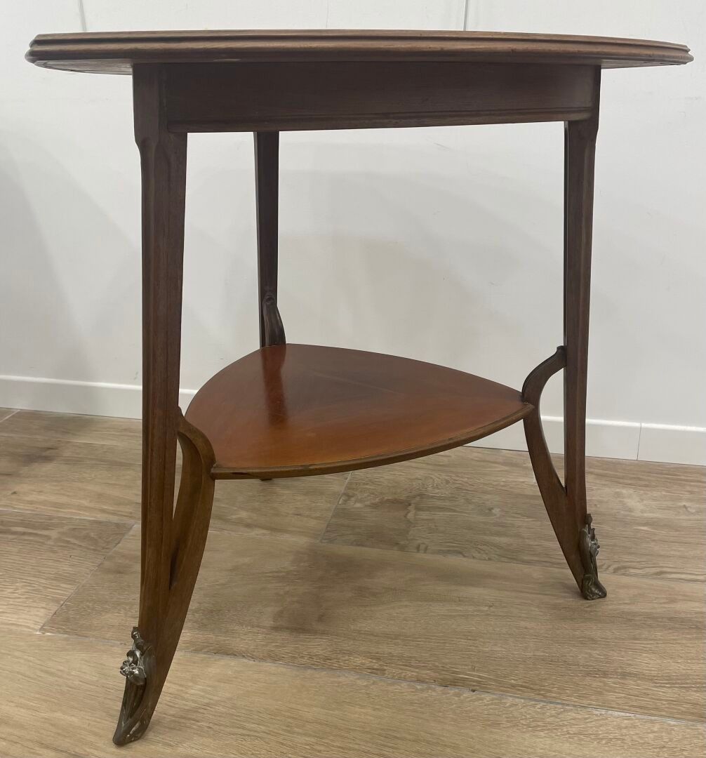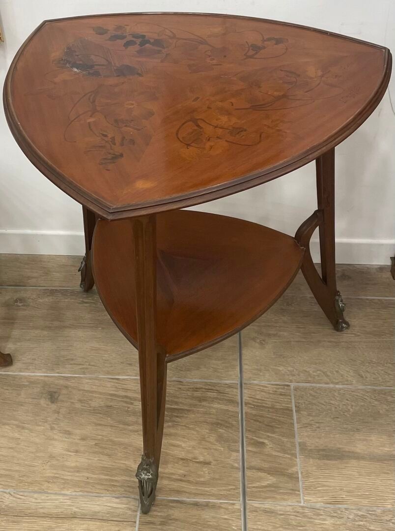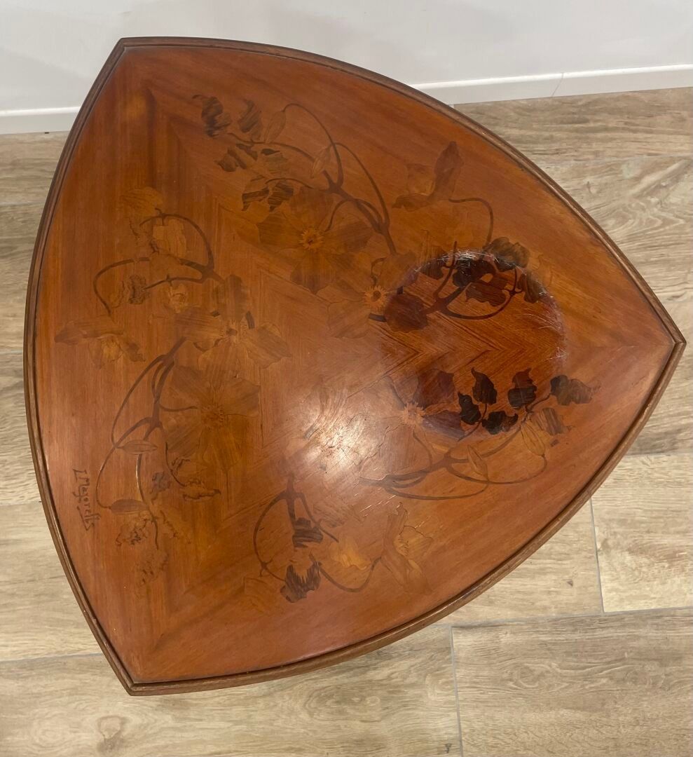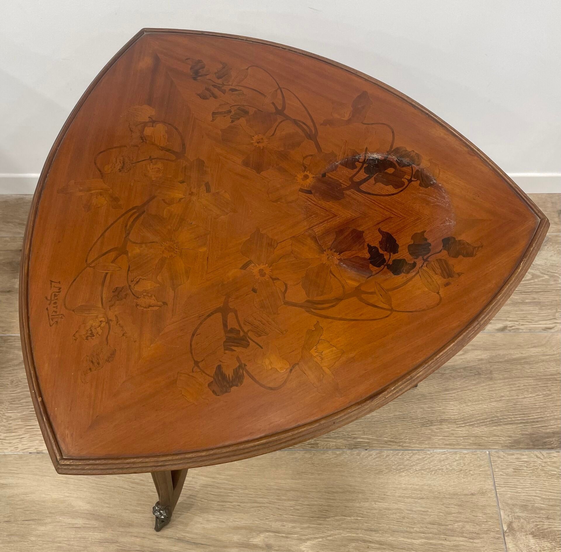 Mahogany and various woods coffee table with two curved triangular tops decorated with floral marquetry on the upper part, carved Art Nouveau sabots. Signed in the marquetry.