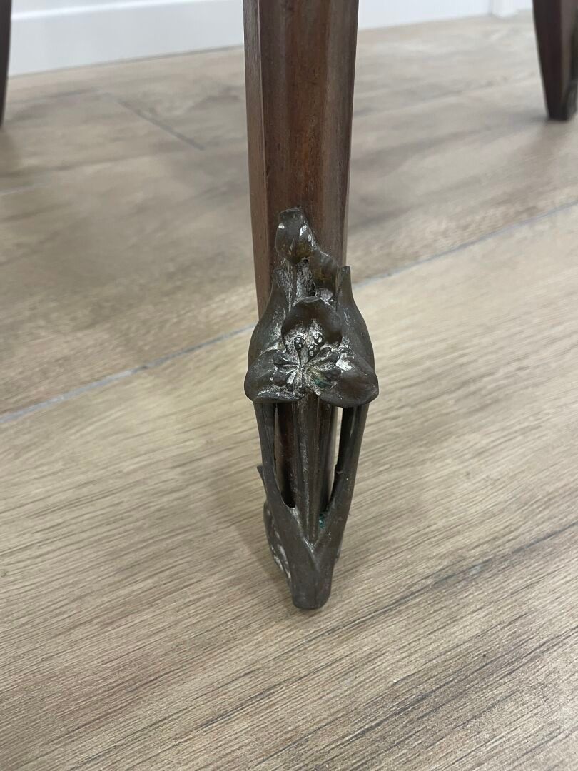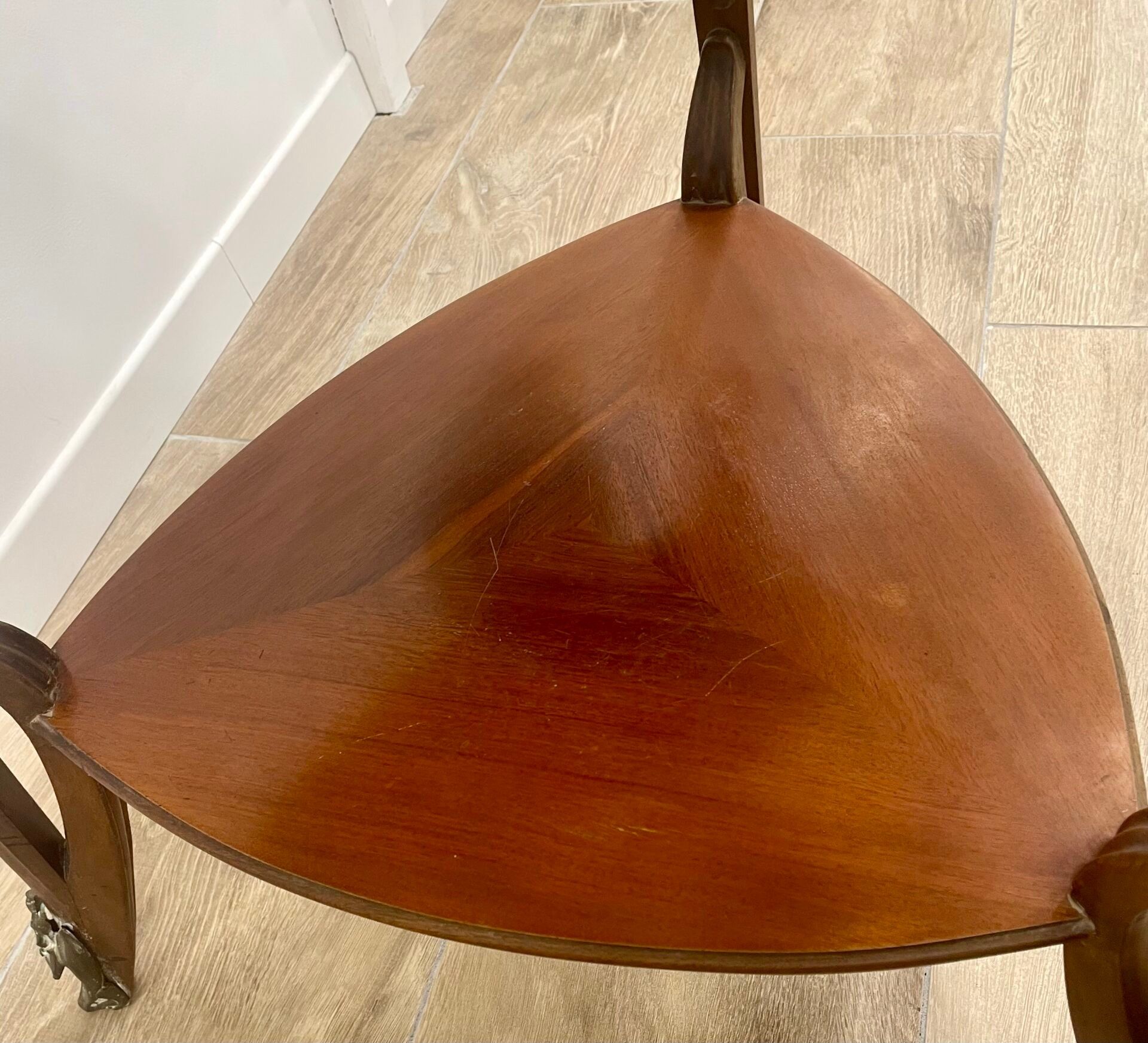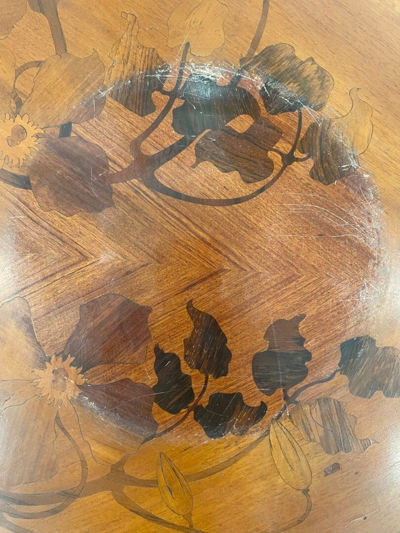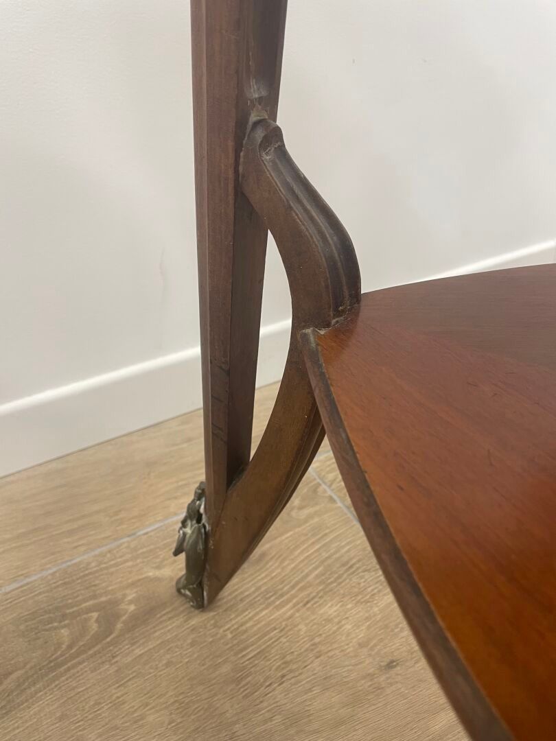 Mahogany and various woods coffee table with two curved triangular tops decorated with floral marquetry on the upper part, carved Art Nouveau sabots. Signed in the marquetry.