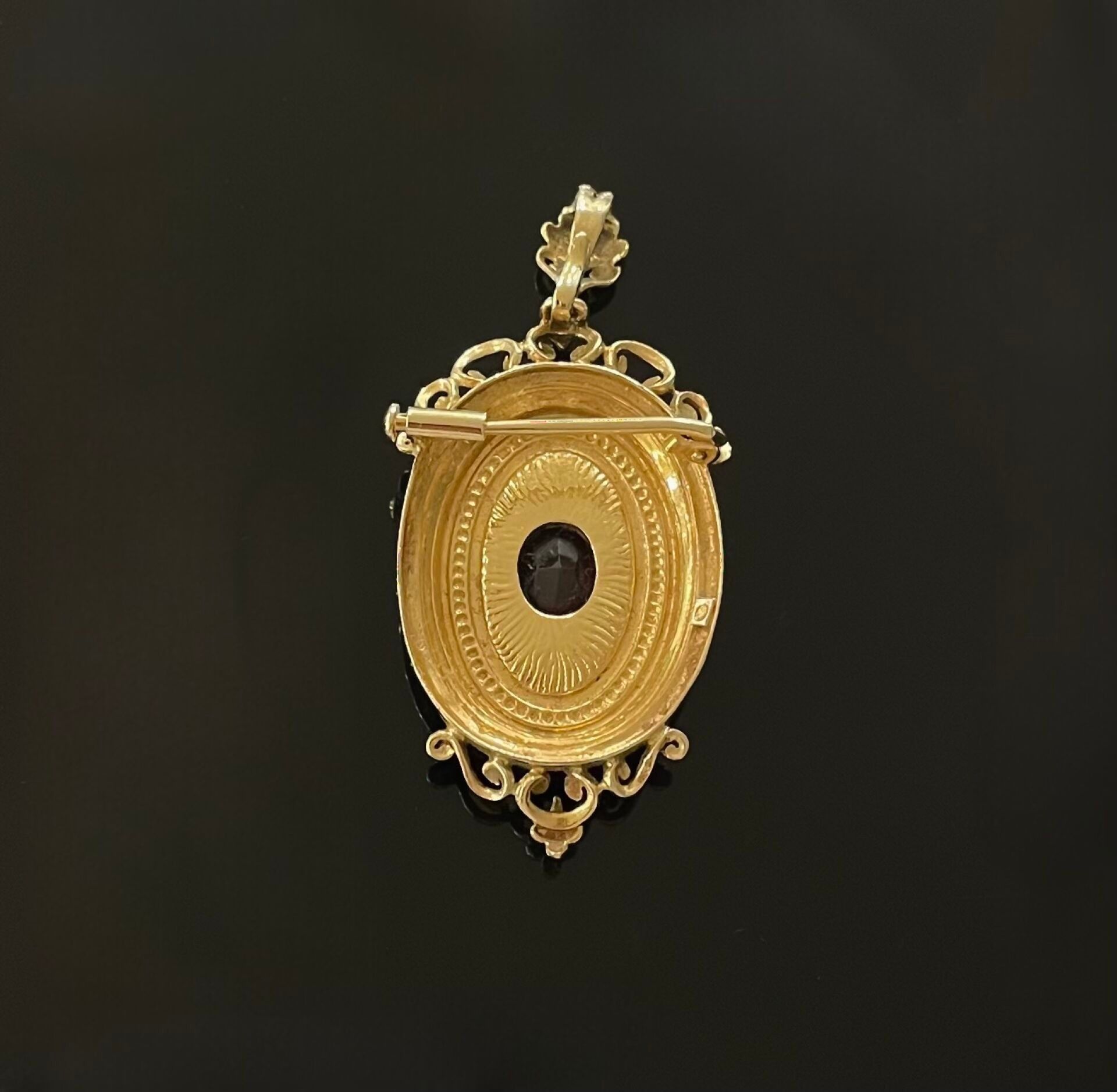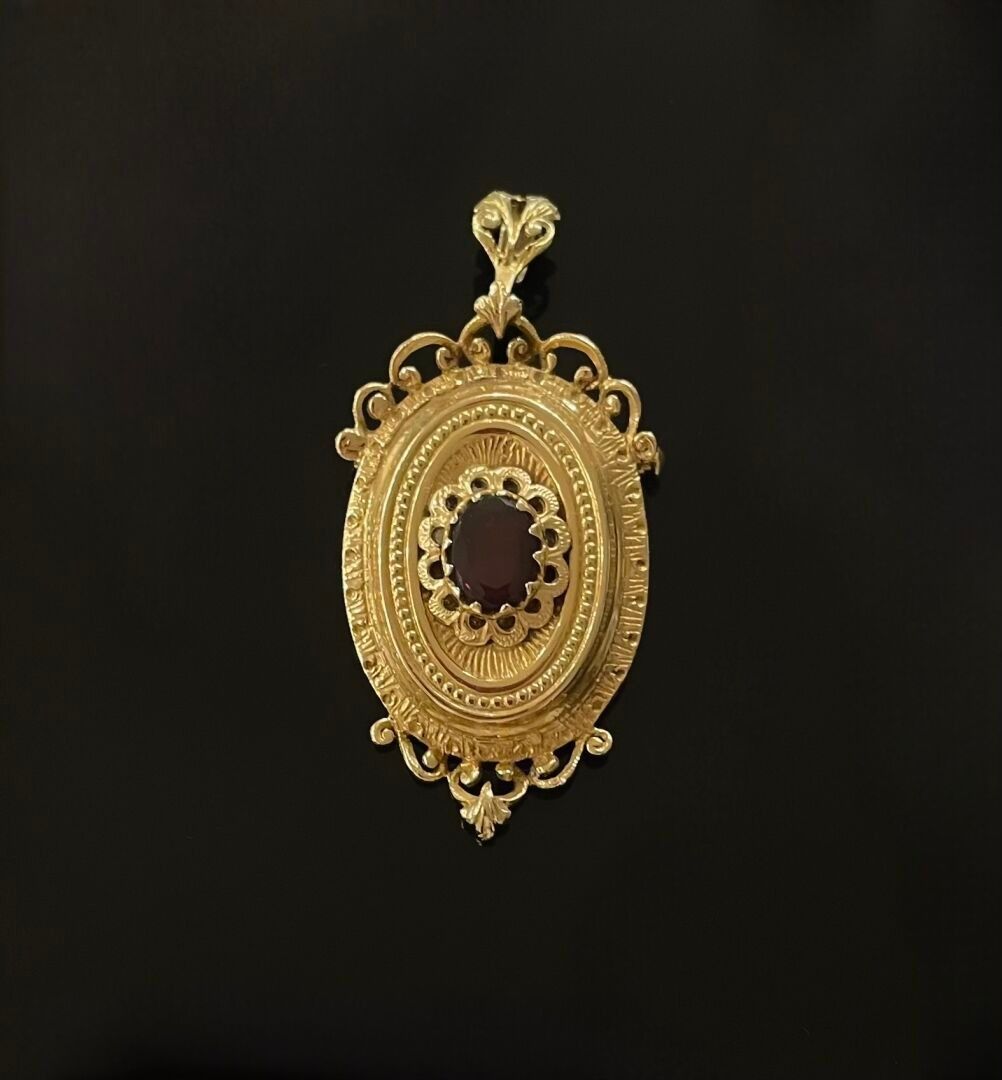 Yellow gold (750) openwork and chased medallion pendant set with a red stone cabochon in the centre, friezes of gilded pearls and stylised motifs.
