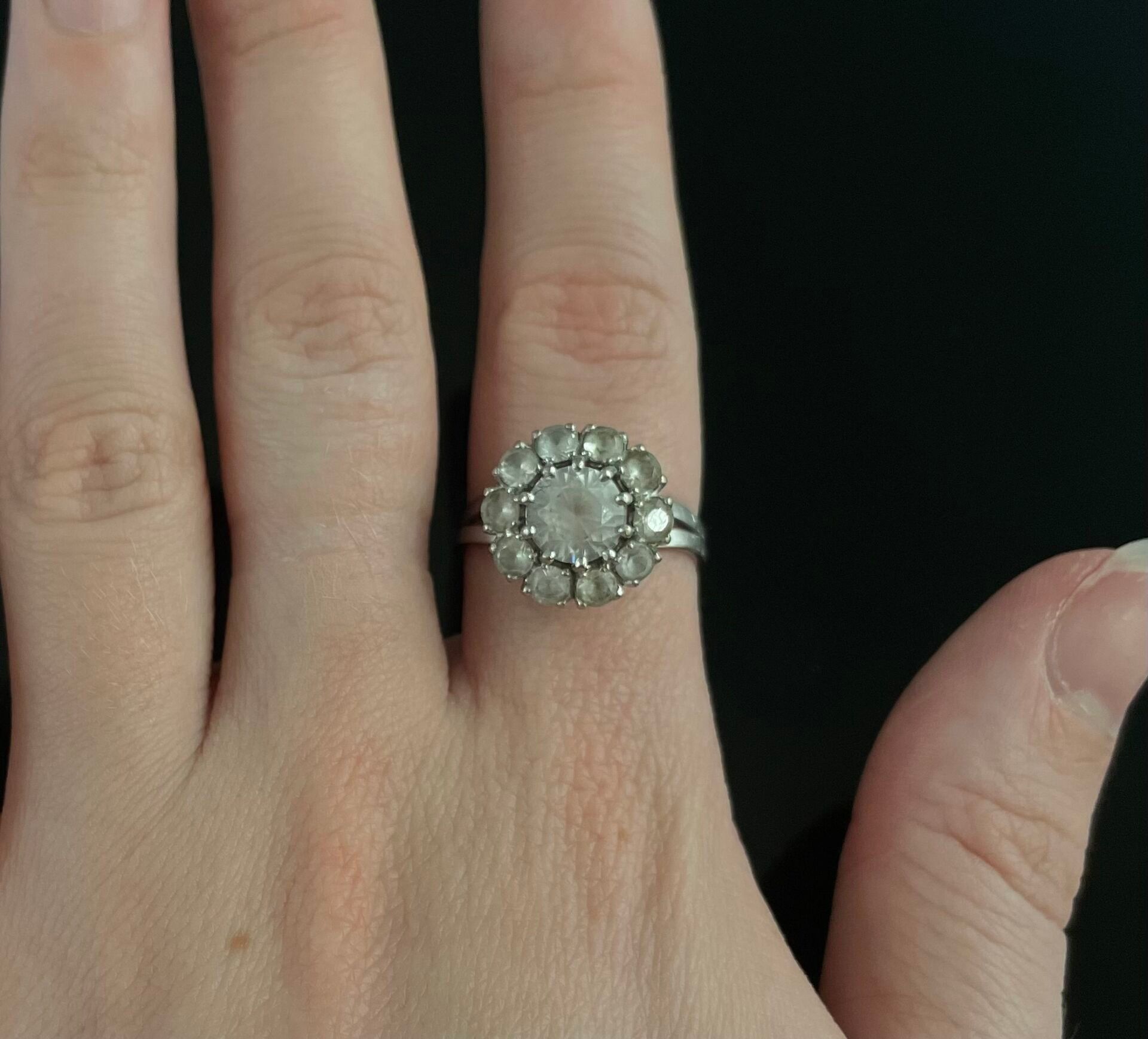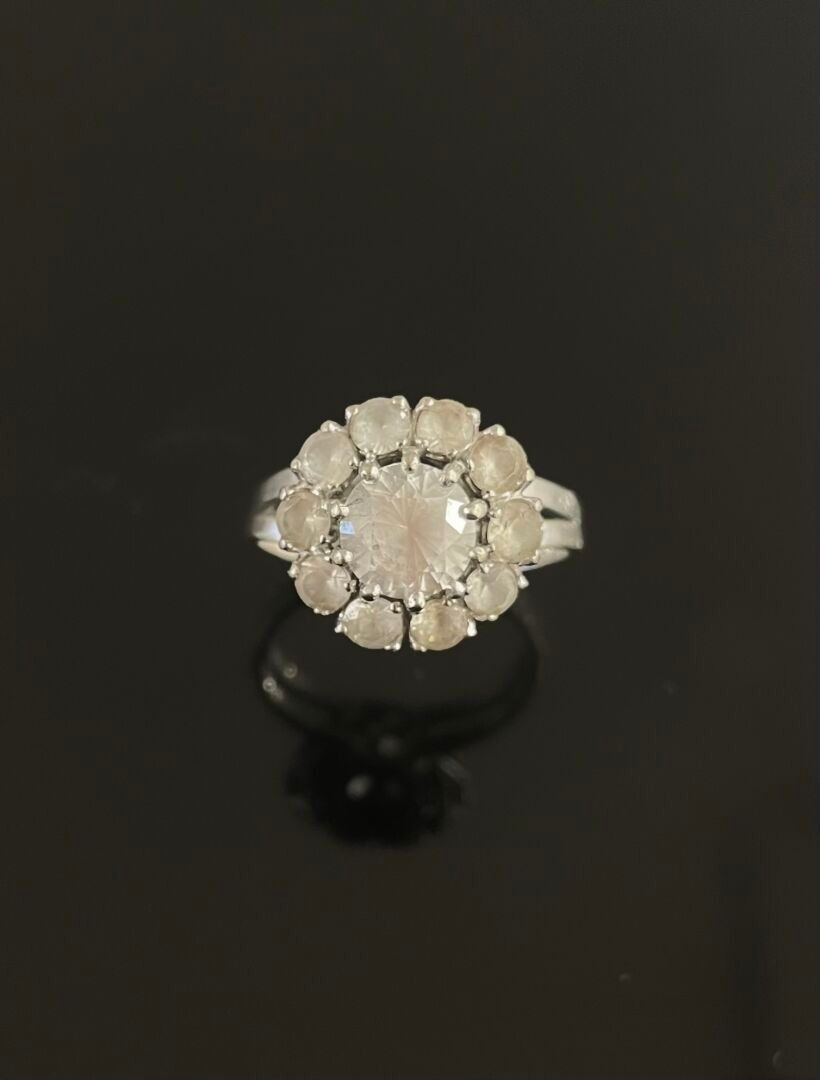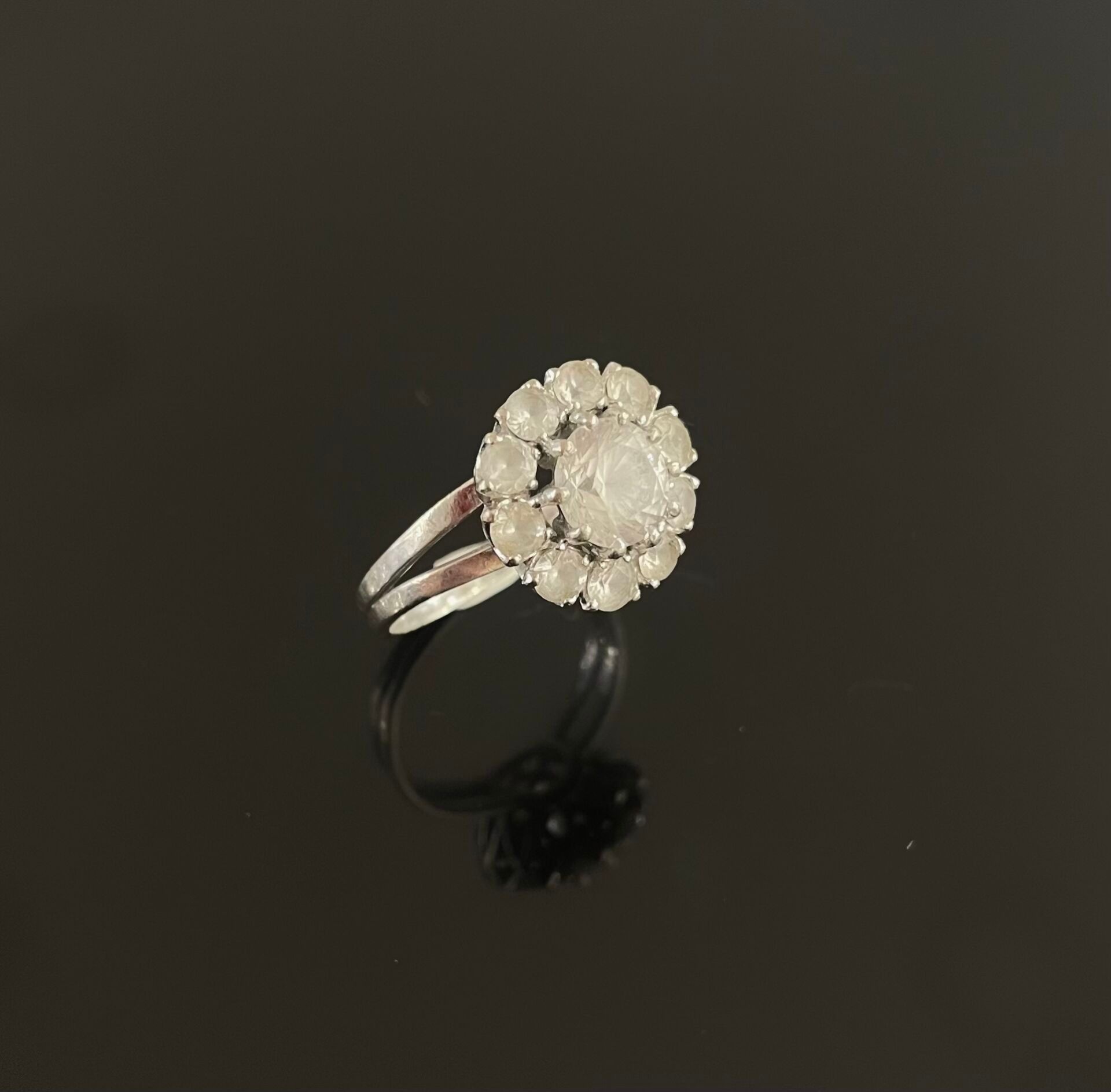 RING in white gold (750) set with a white stone surrounded by white stones forming a flower