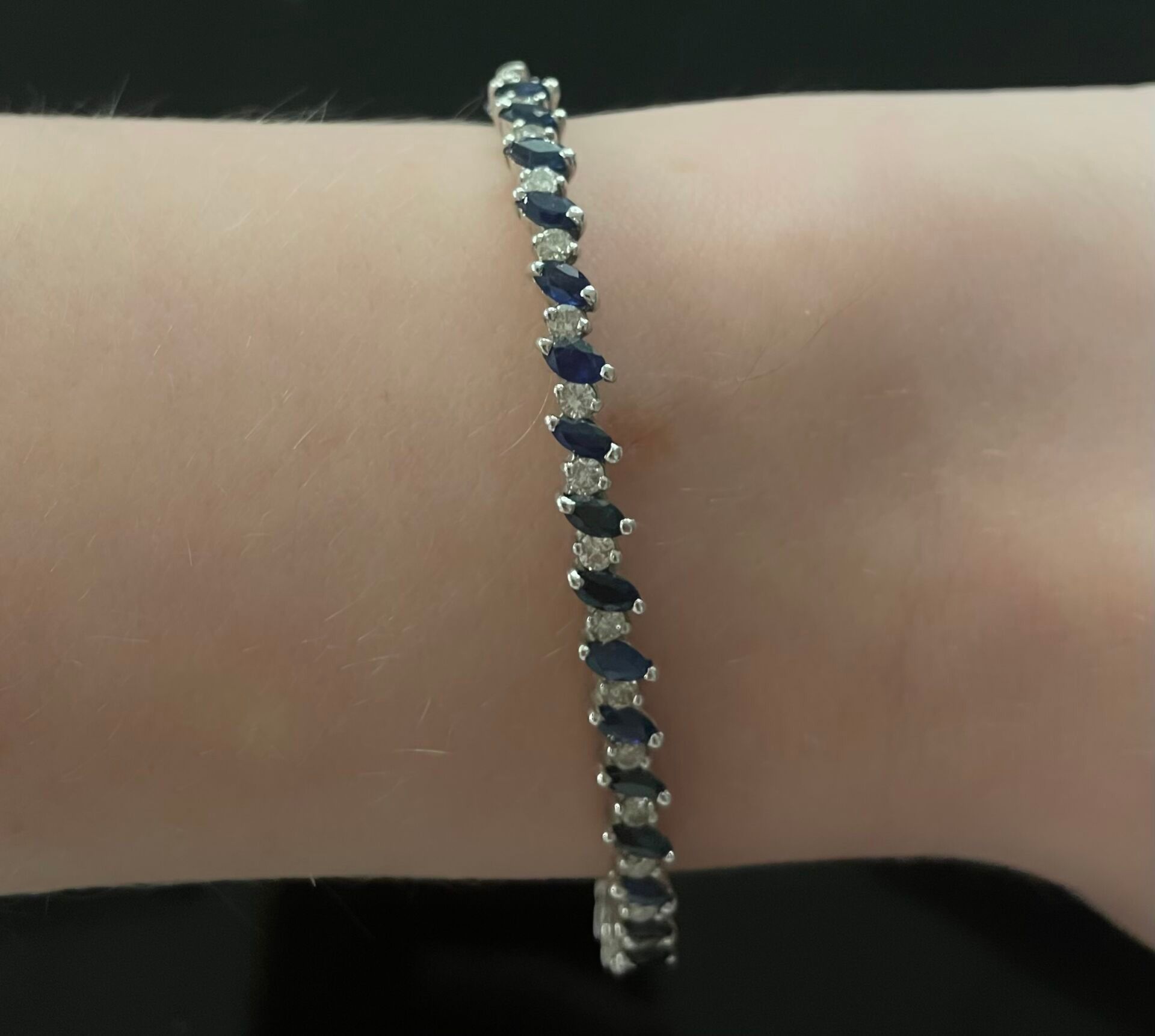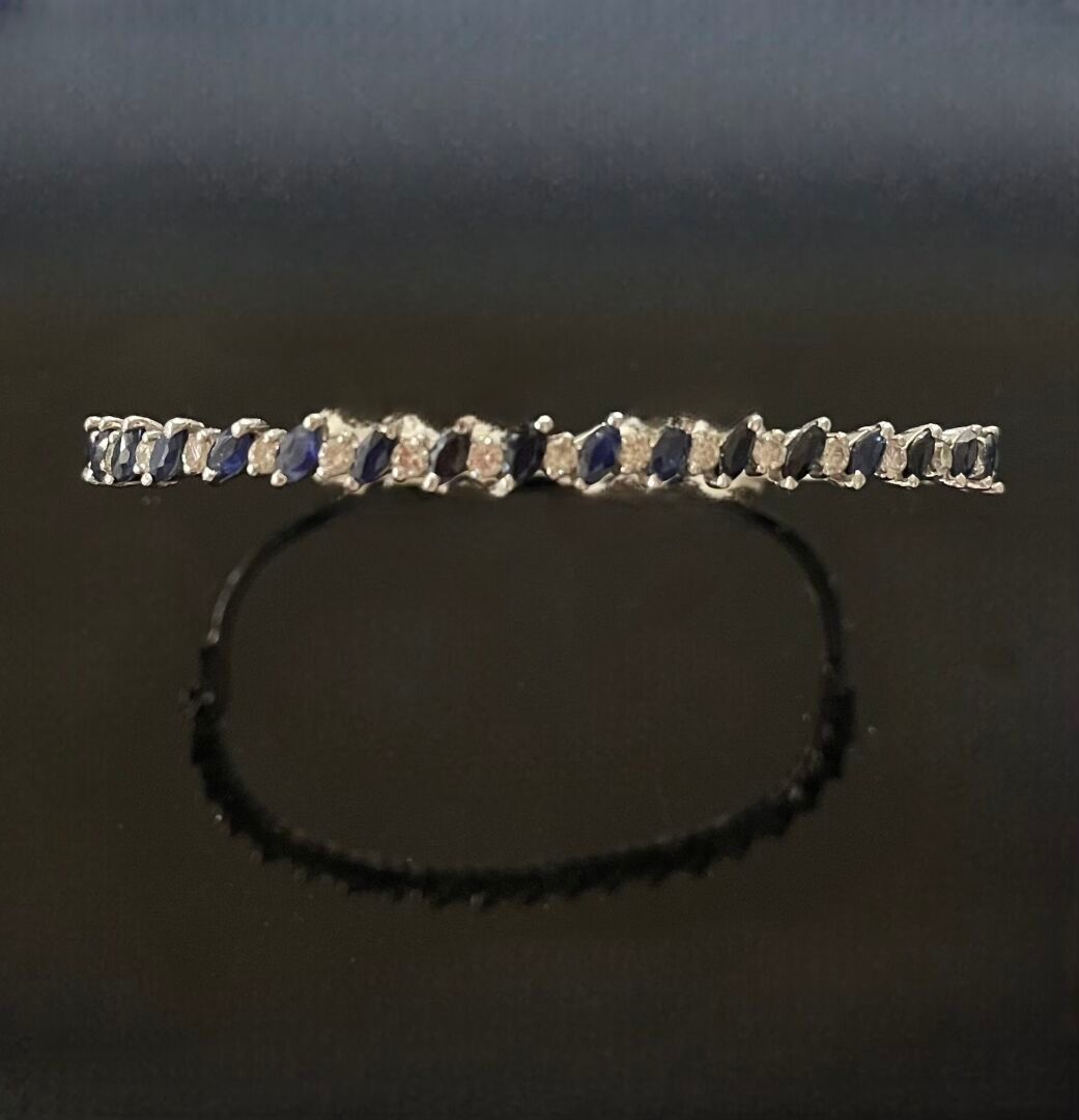 Rigid hinged necklace in white gold (750), set with a line of navette-cut sapphires alternating with claw-set round diamonds. It is fitted with an eight safety clasp.