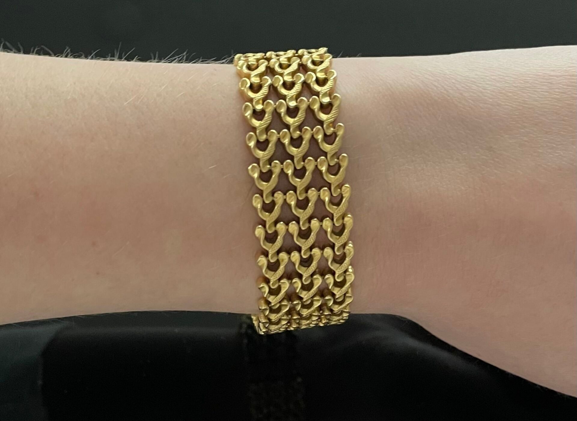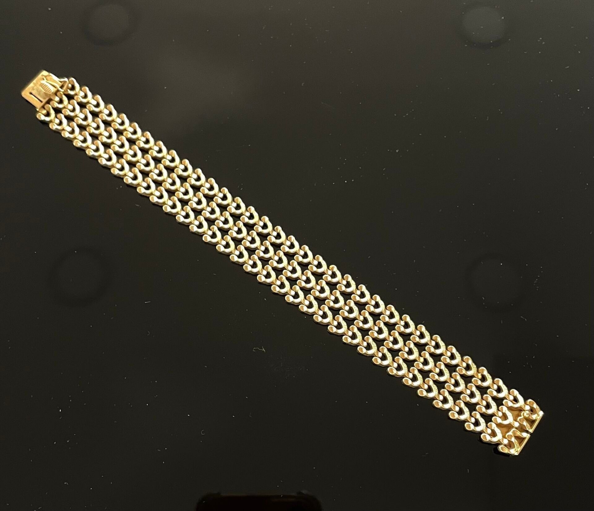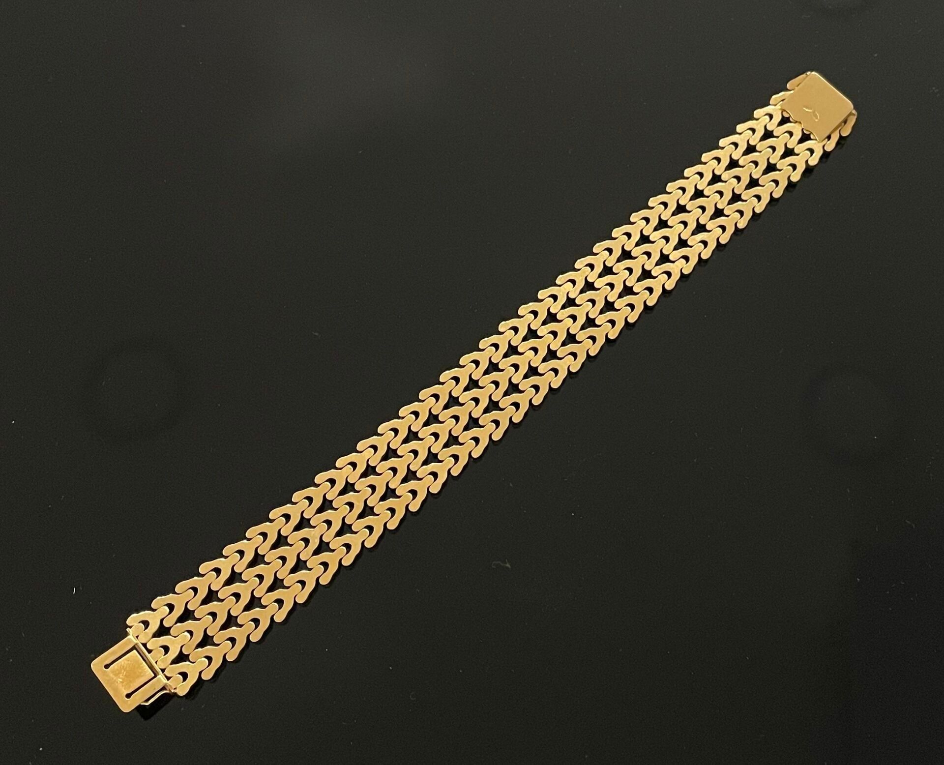 BRACELET in yellow gold (750) with three rows of partially openworked and engine-turned fancy links