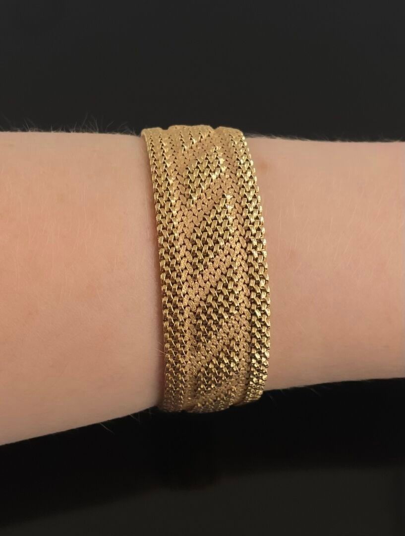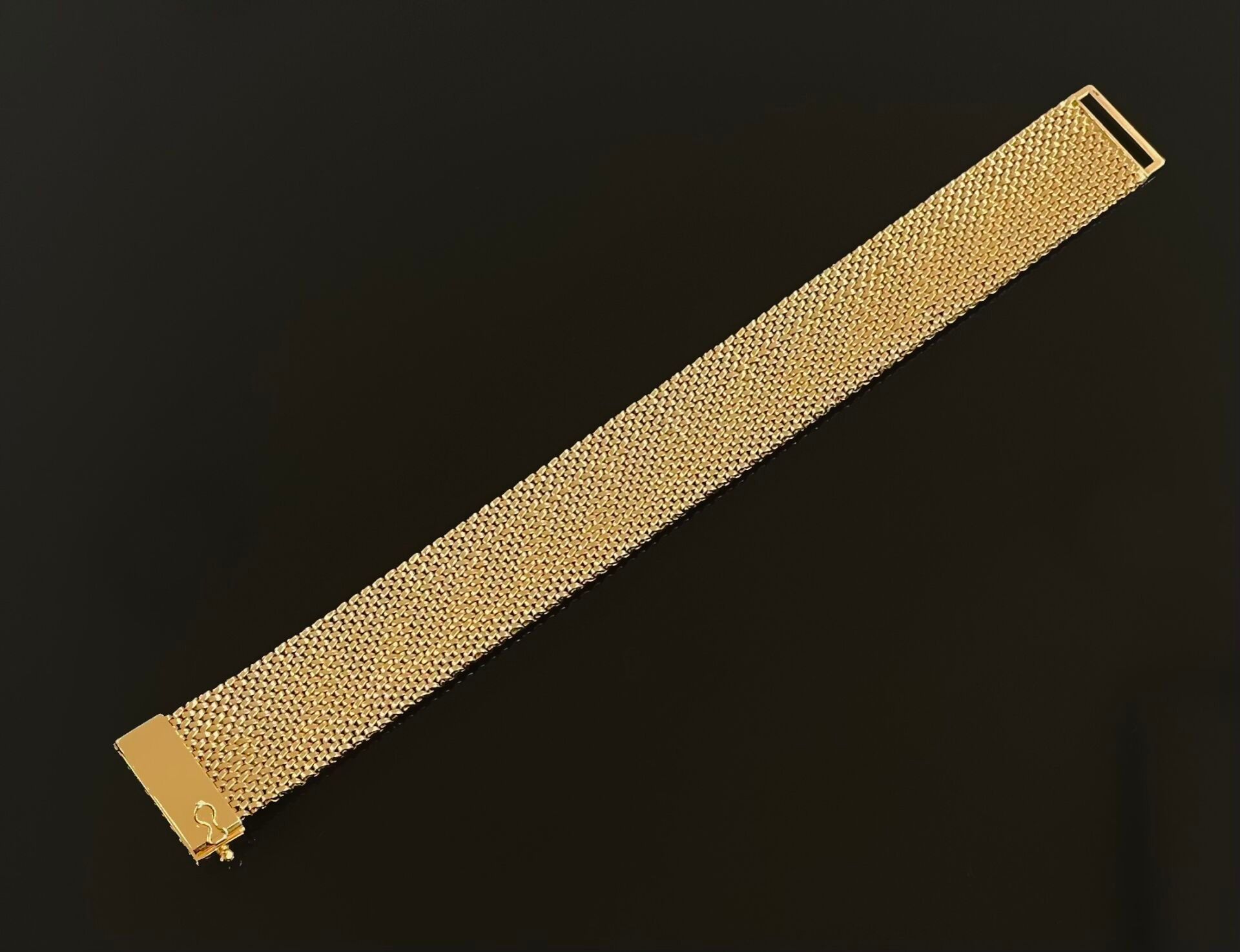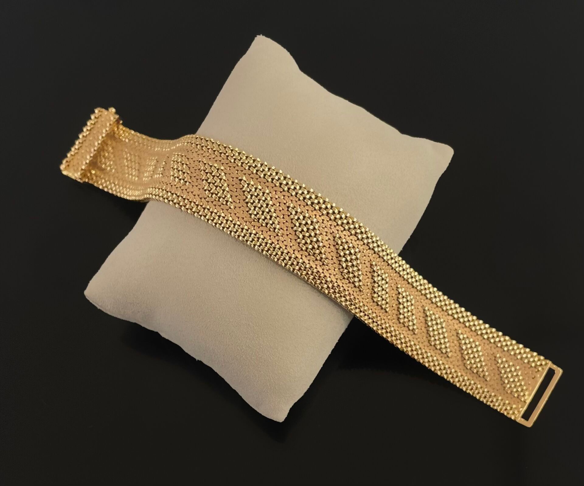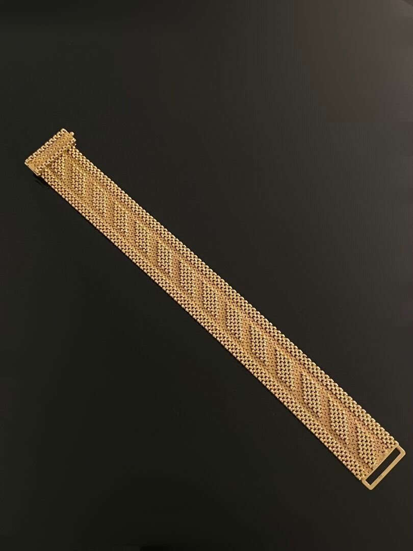 Ribbon BRACELET in yellow gold (750) with flexible polonaise mesh, geometric motifs, the clasp with a safety eight.