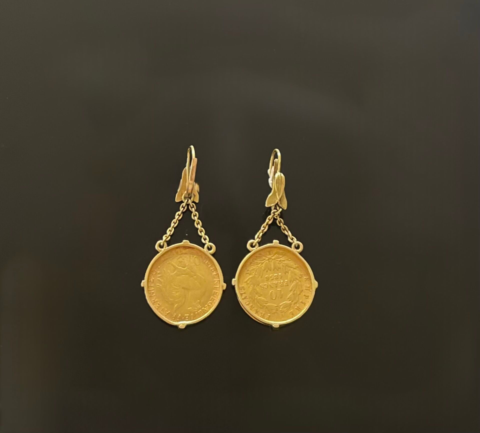 EARRINGS in gold (750) each holding a 10 frc Napoléon III gold coin