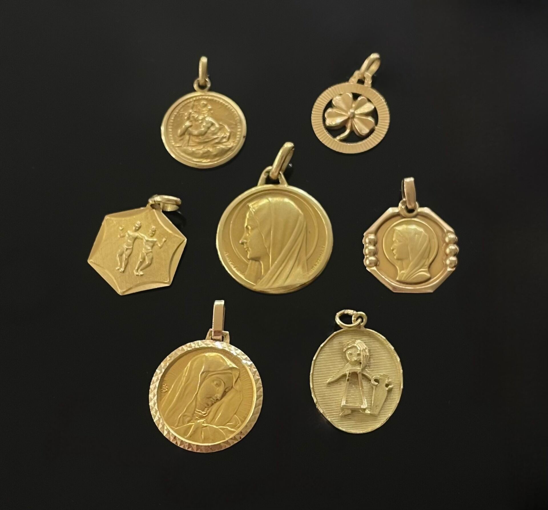 Lot of seven medallion PENDANTS in yellow gold (750) representing the Virgin Mary, a trefoil and figures