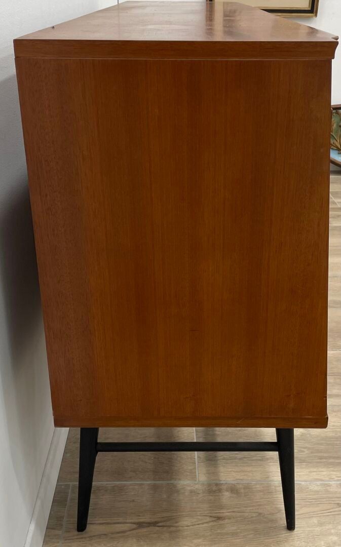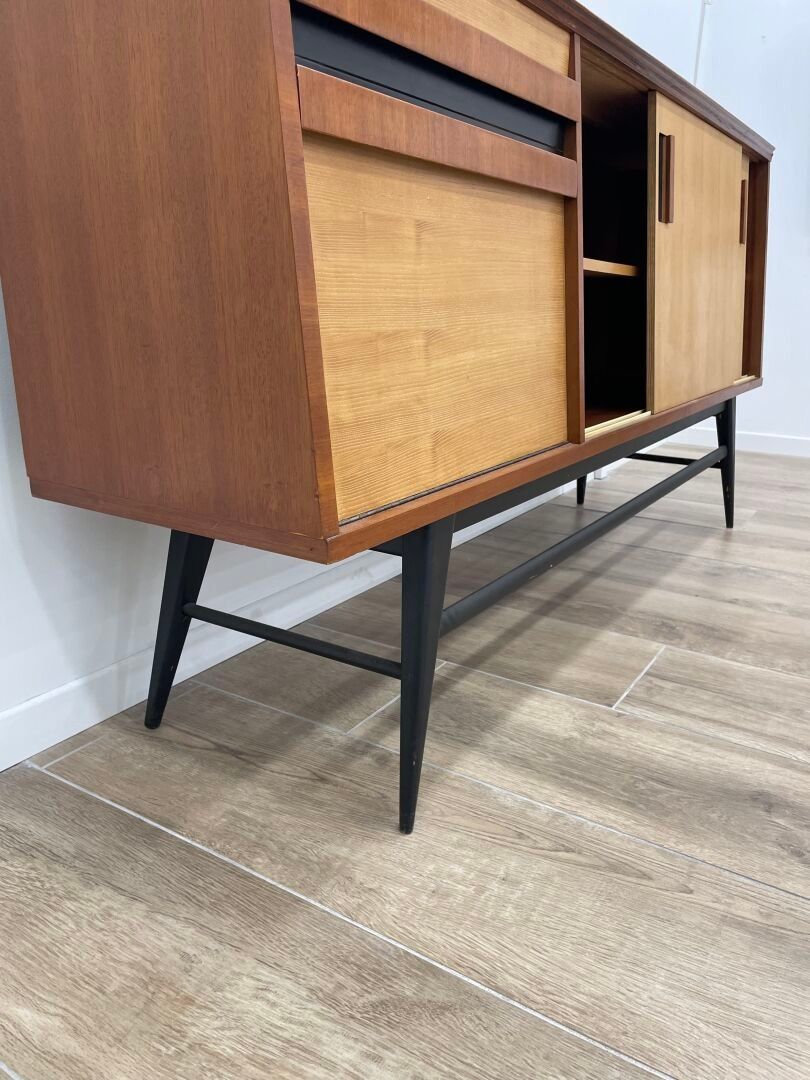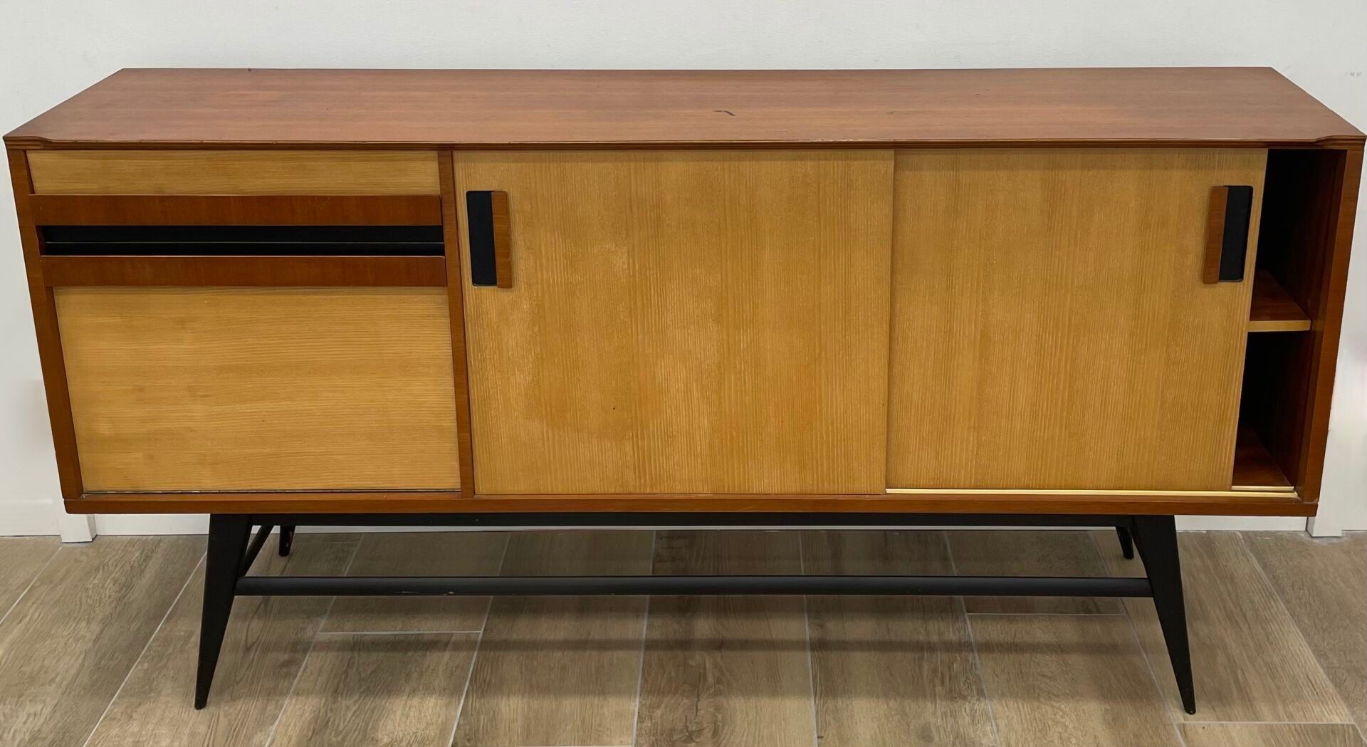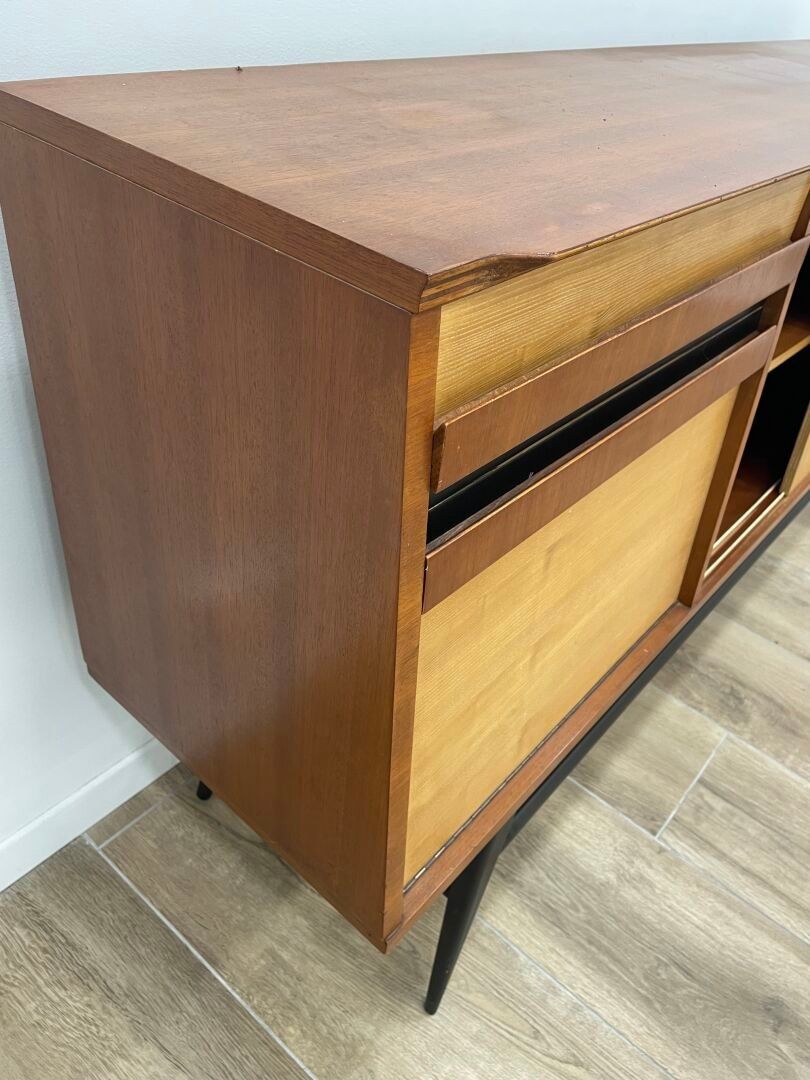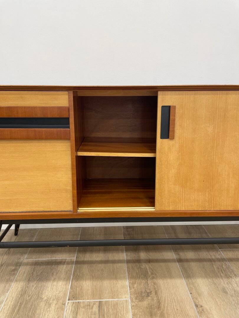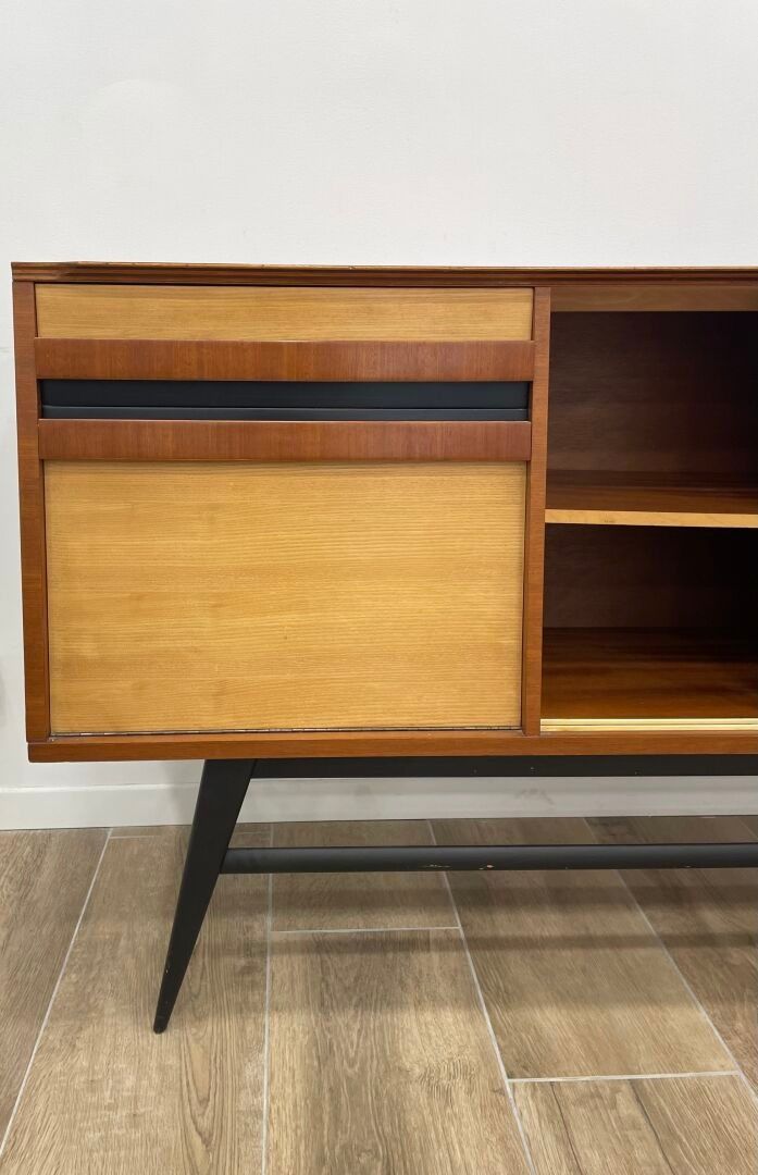 Wood and veneer sideboard opening with two sliding doors on the right and a drawer and a flap on the left. Blackened metal legs.