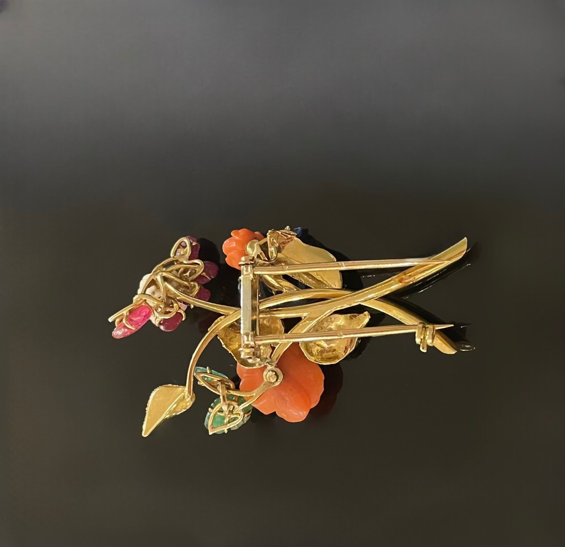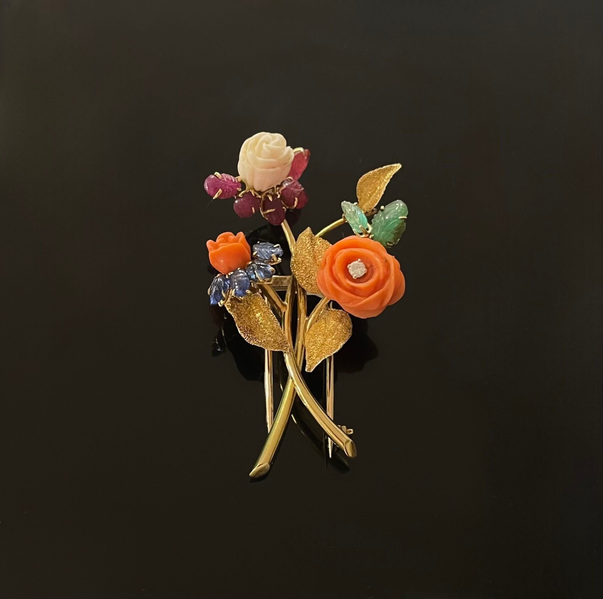 Yellow gold (750) brooch forming a bouquet of flowers and foliage composed of coral, coloured stones and brilliant-cut diamonds.