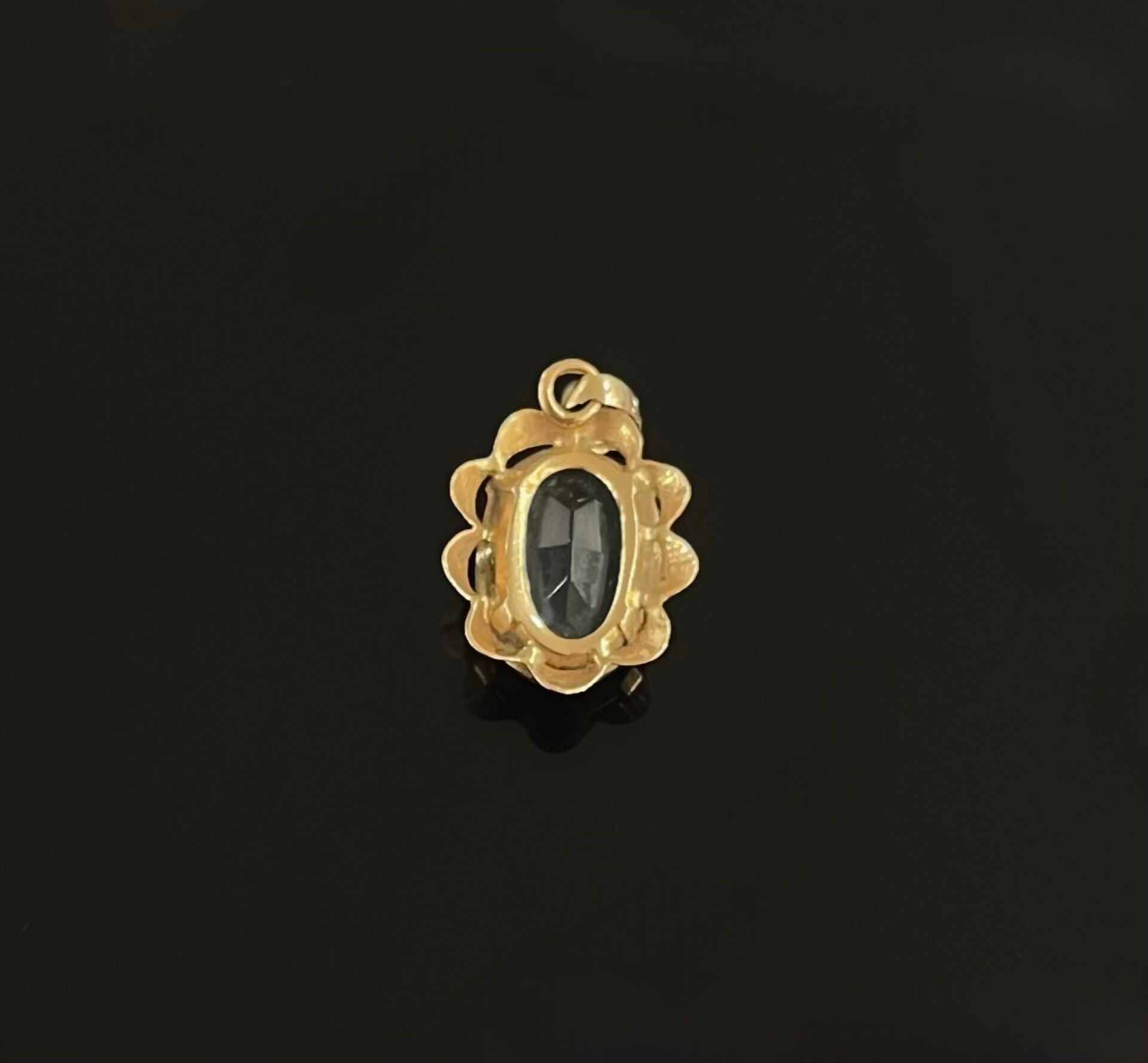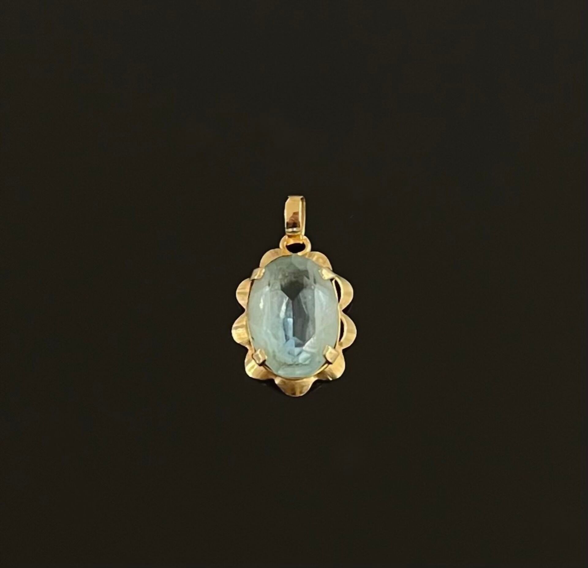 Yellow gold (750) PENDANT set with a claw-set light blue stone, openwork setting