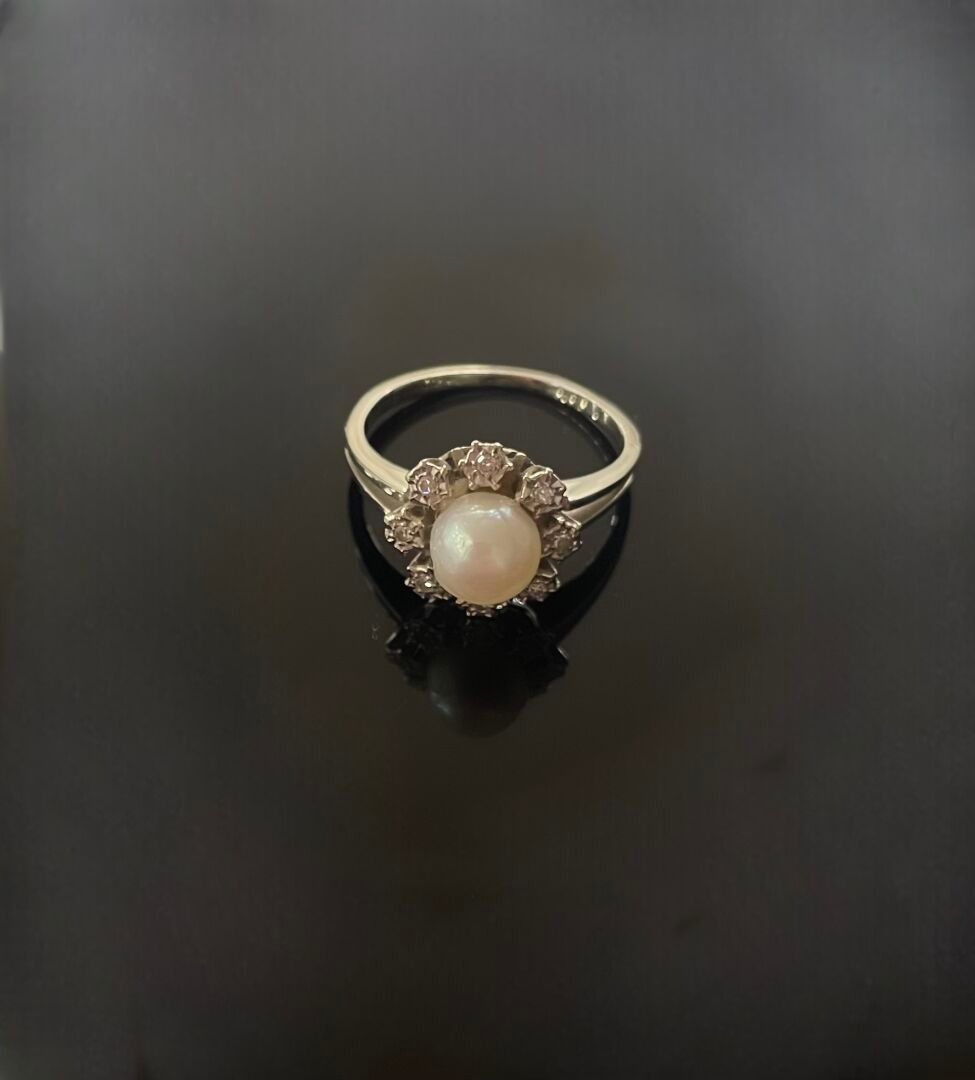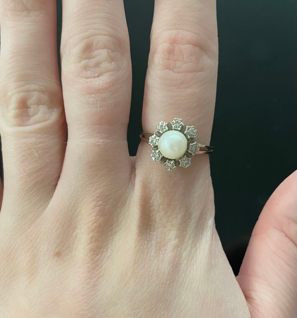 RING in white gold (750) set with a pearl and surrounded by small diamonds in a claw setting
