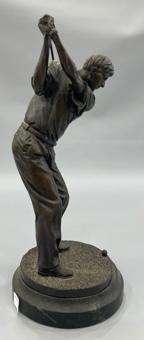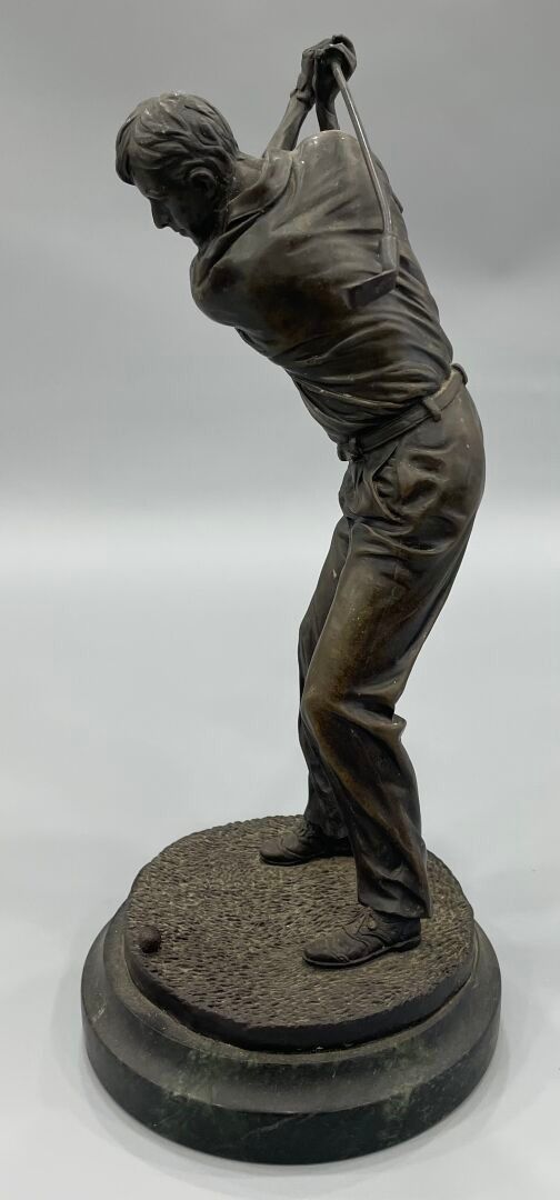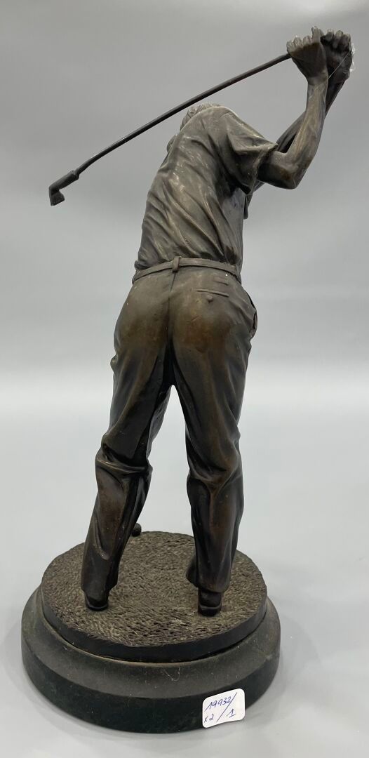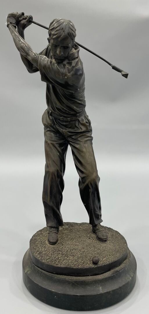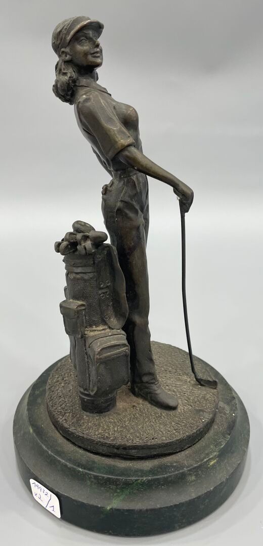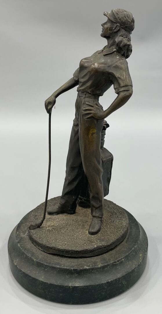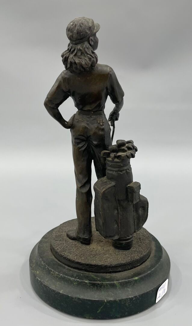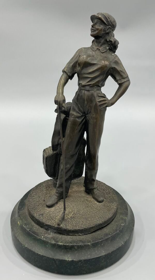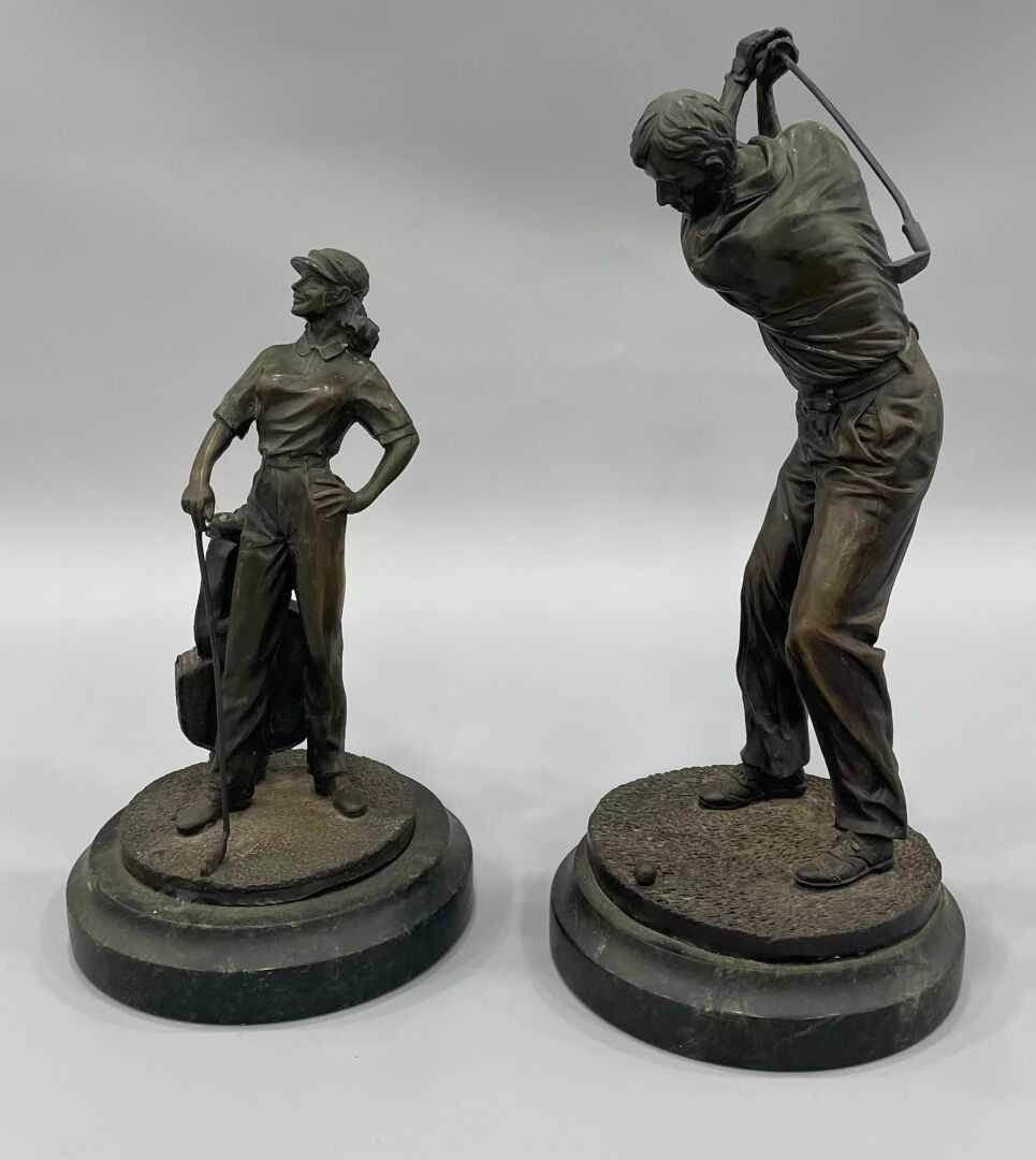 A set of two bronzes depicting a golfer in full swing and a female golfer standing on her golf club.