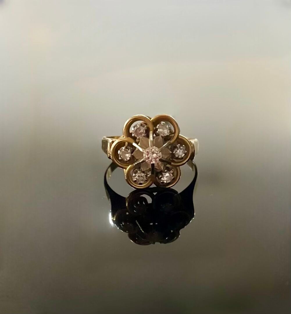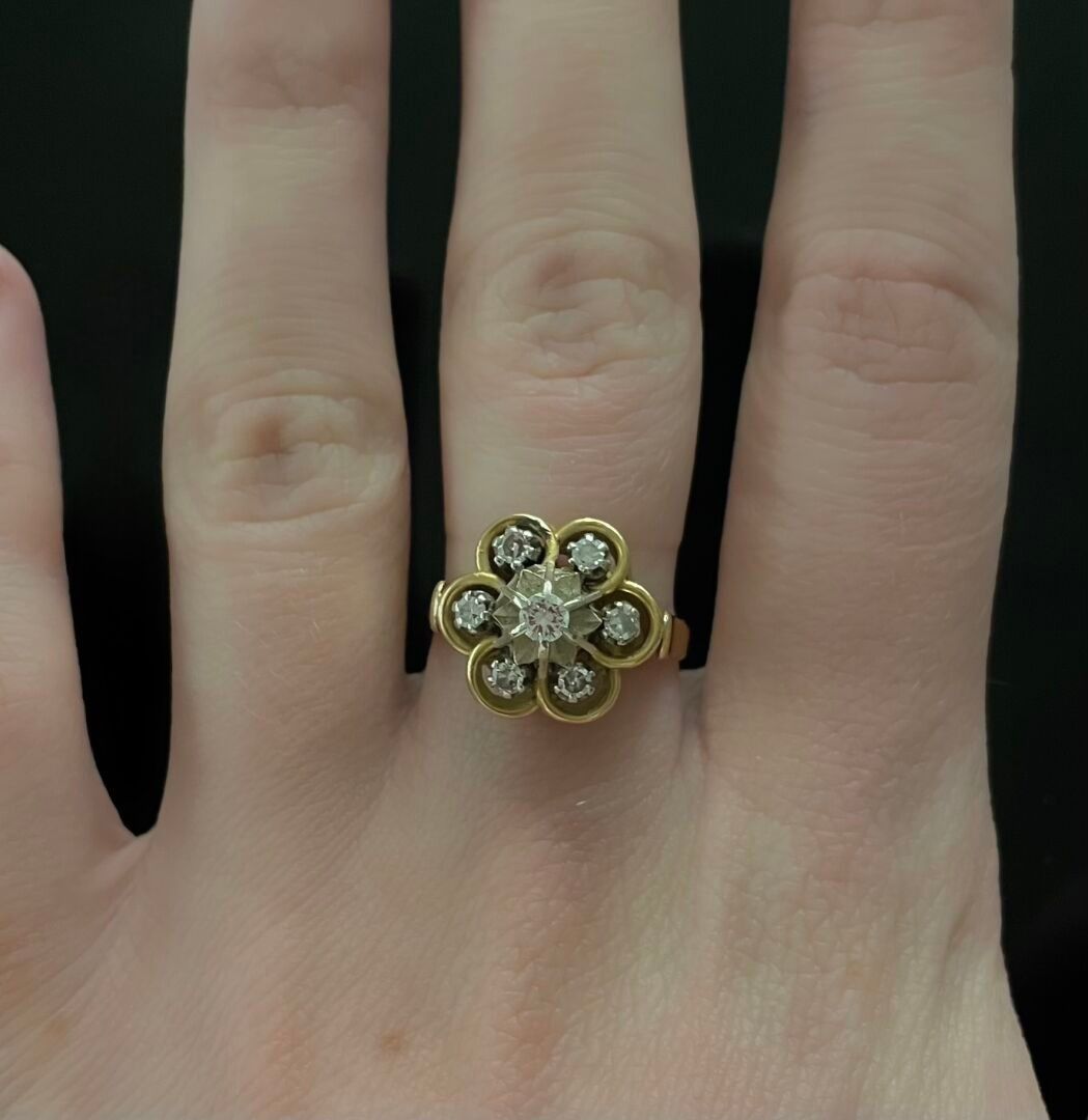 RING in yellow gold (750) set with seven claw-set diamonds forming a floral motif, one central diamond weighing approx. 0.10 ct