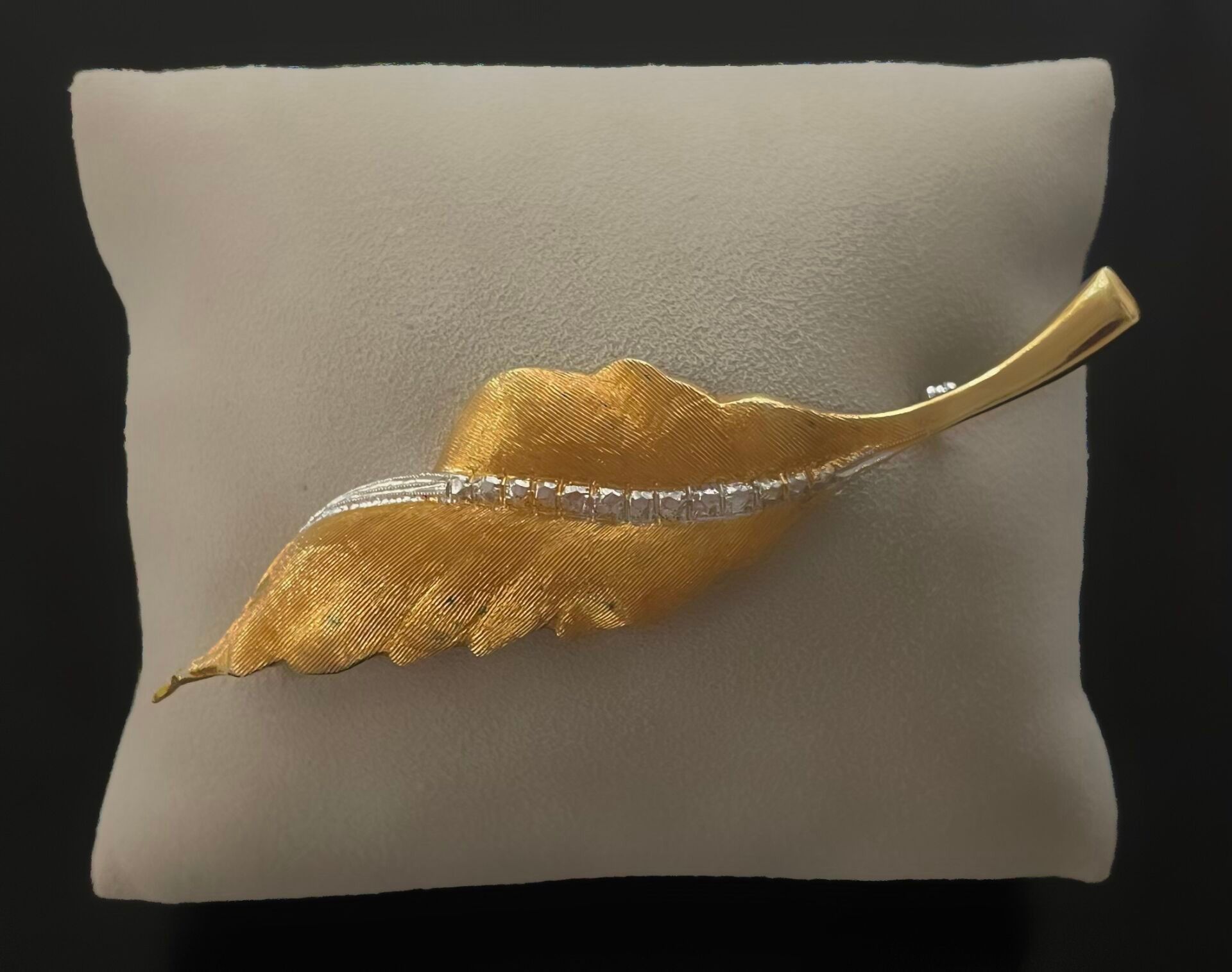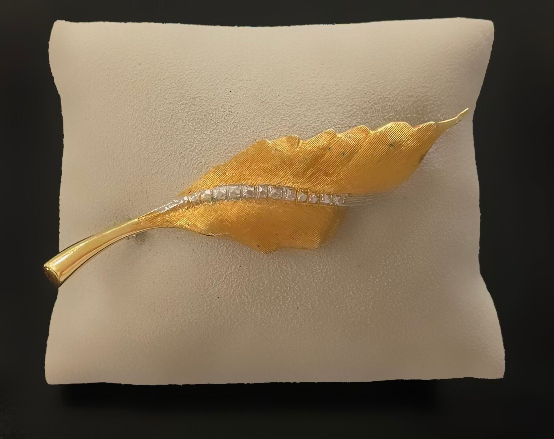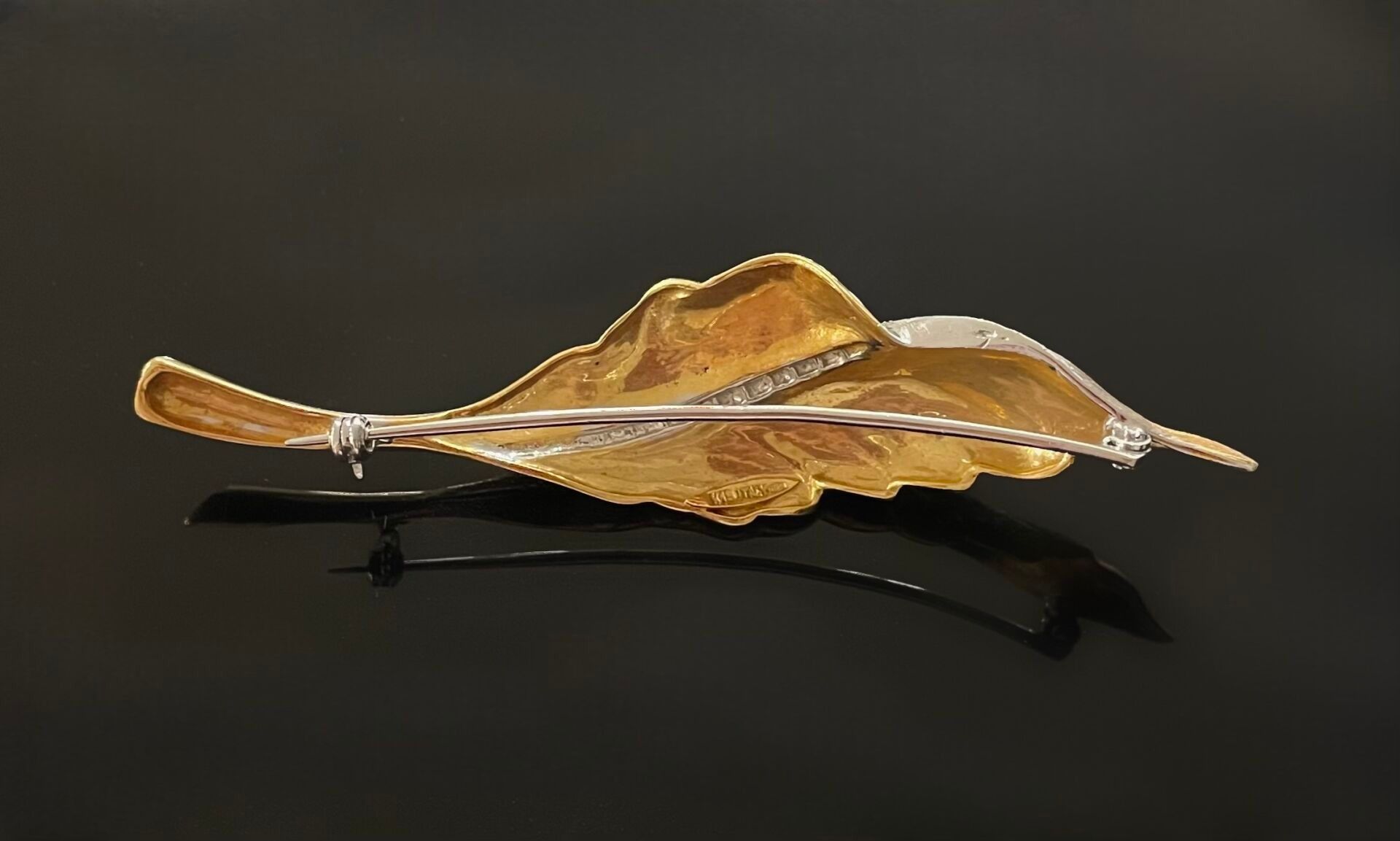 Leaf brooch in yellow gold (750), partially decorated with diamonds