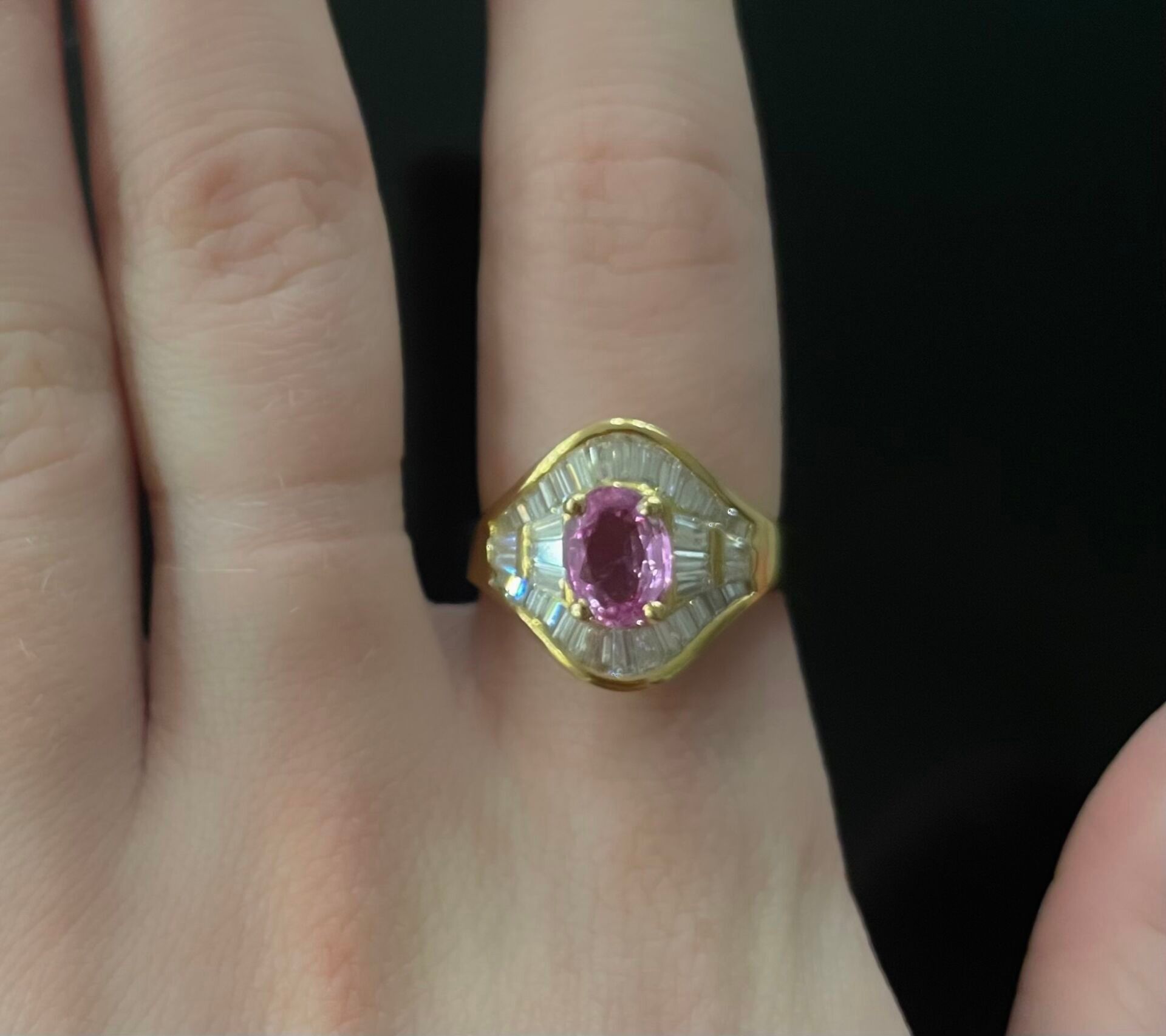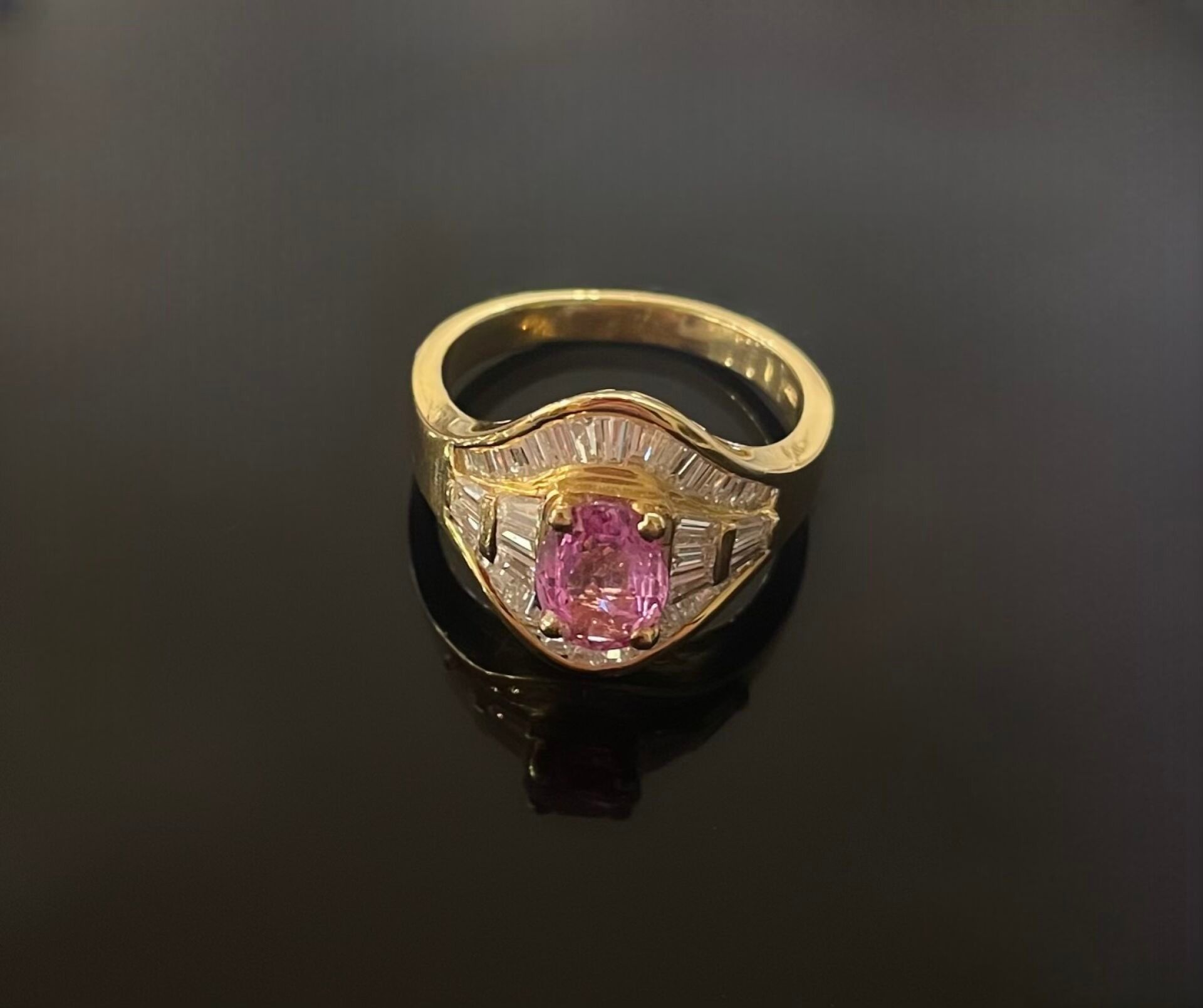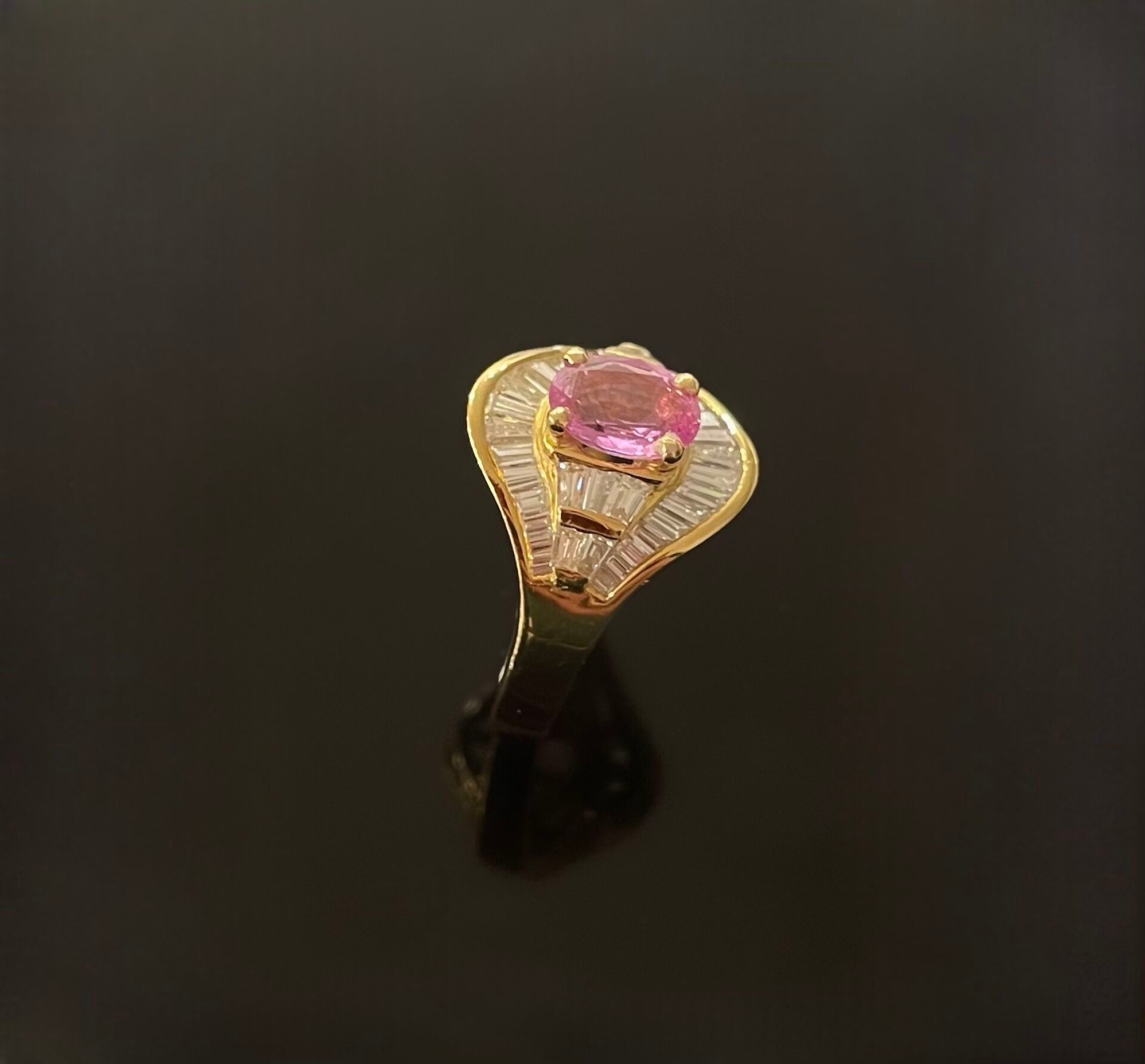 RING in yellow gold (750) set with a pink stone surrounded by baguette diamonds