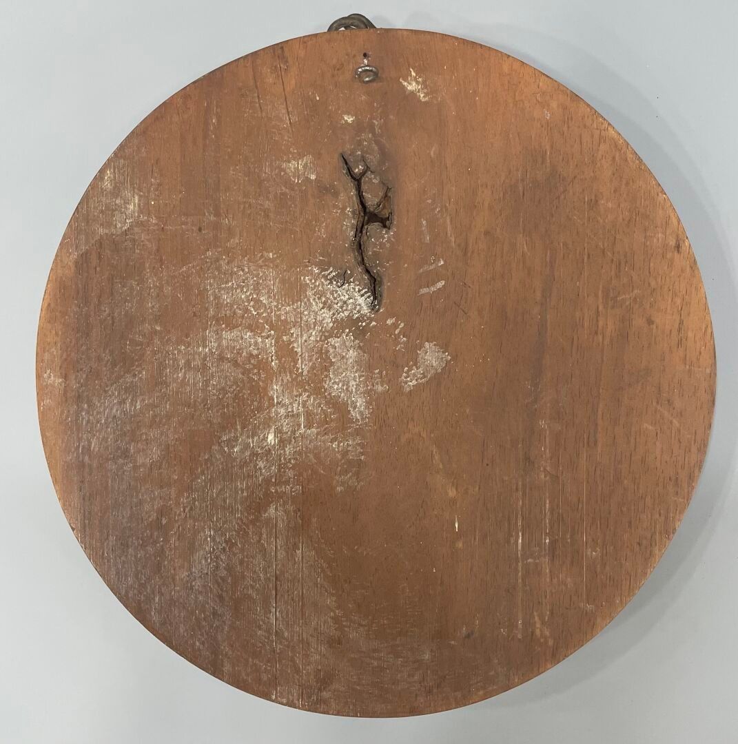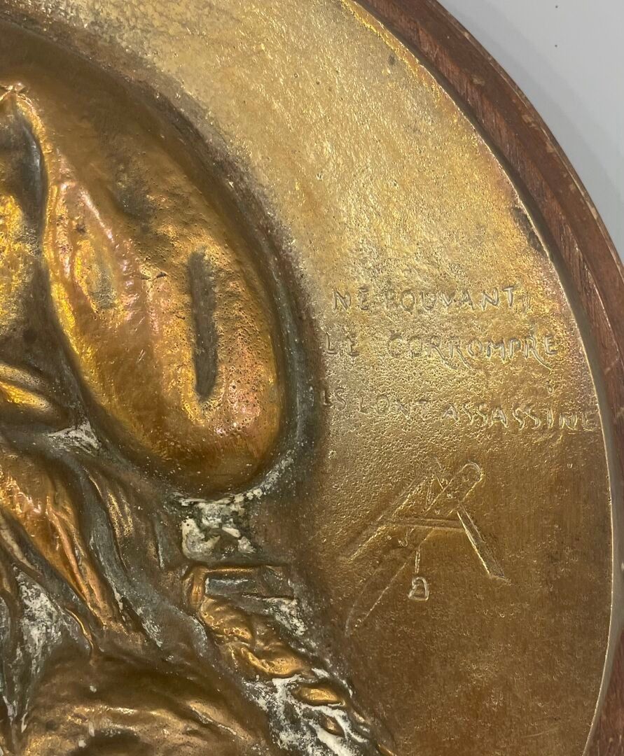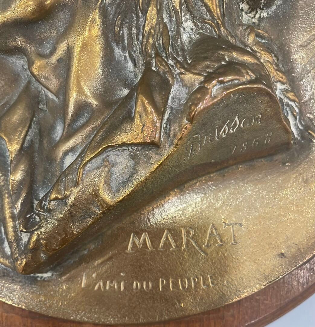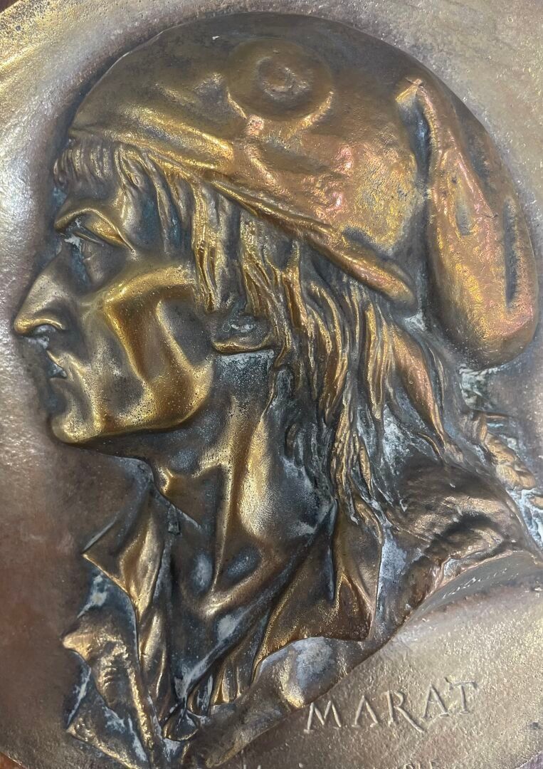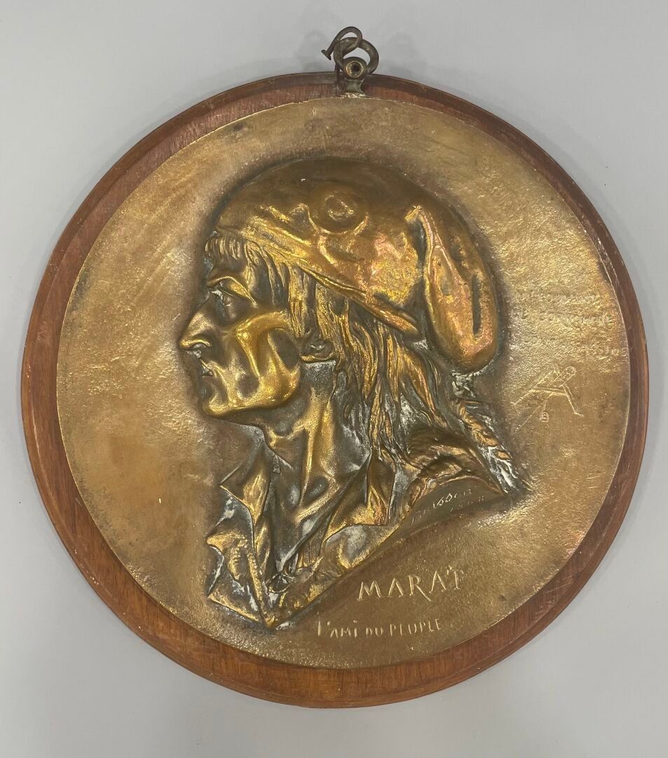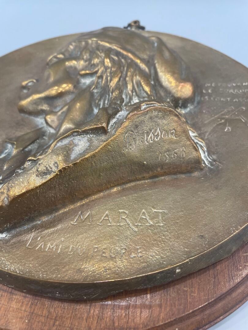 Bronze medal representing Marat in profile "the people's friend" resting on a wooden base.