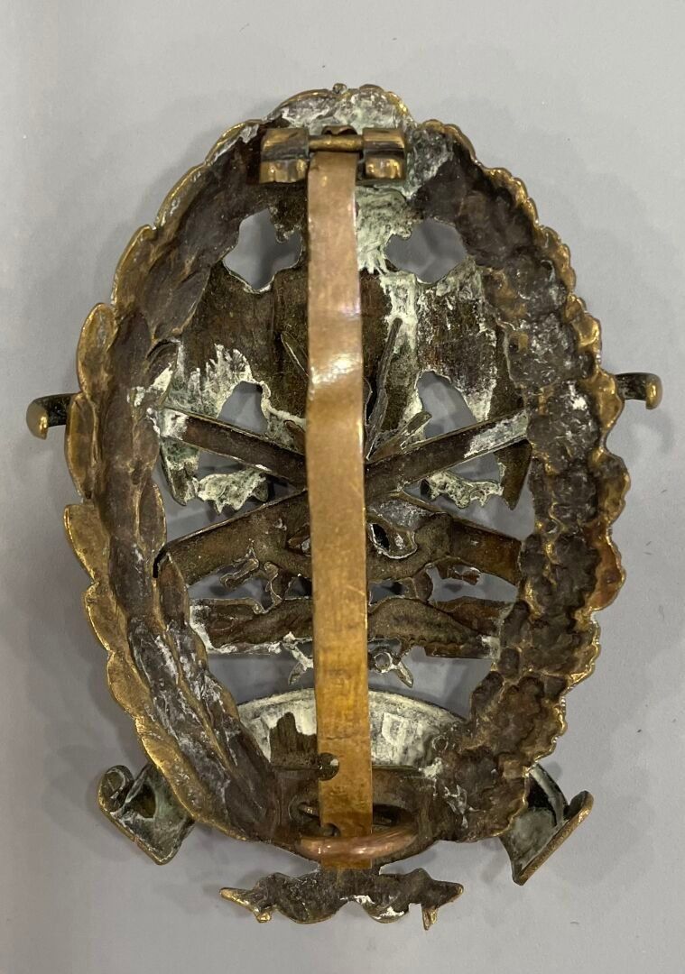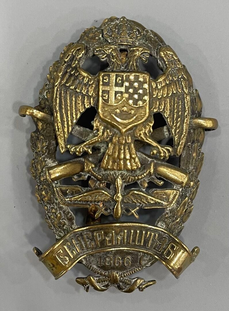 Royal Yugoslav Army headquarters badge, in patinated bronze, with its pin, decorated with the coat of arms of the Yugoslav kingdom, with a ribbon banner at the base inscribed "ГЕНЕРАЛШТАБ" (General Staff) above the date "1866".