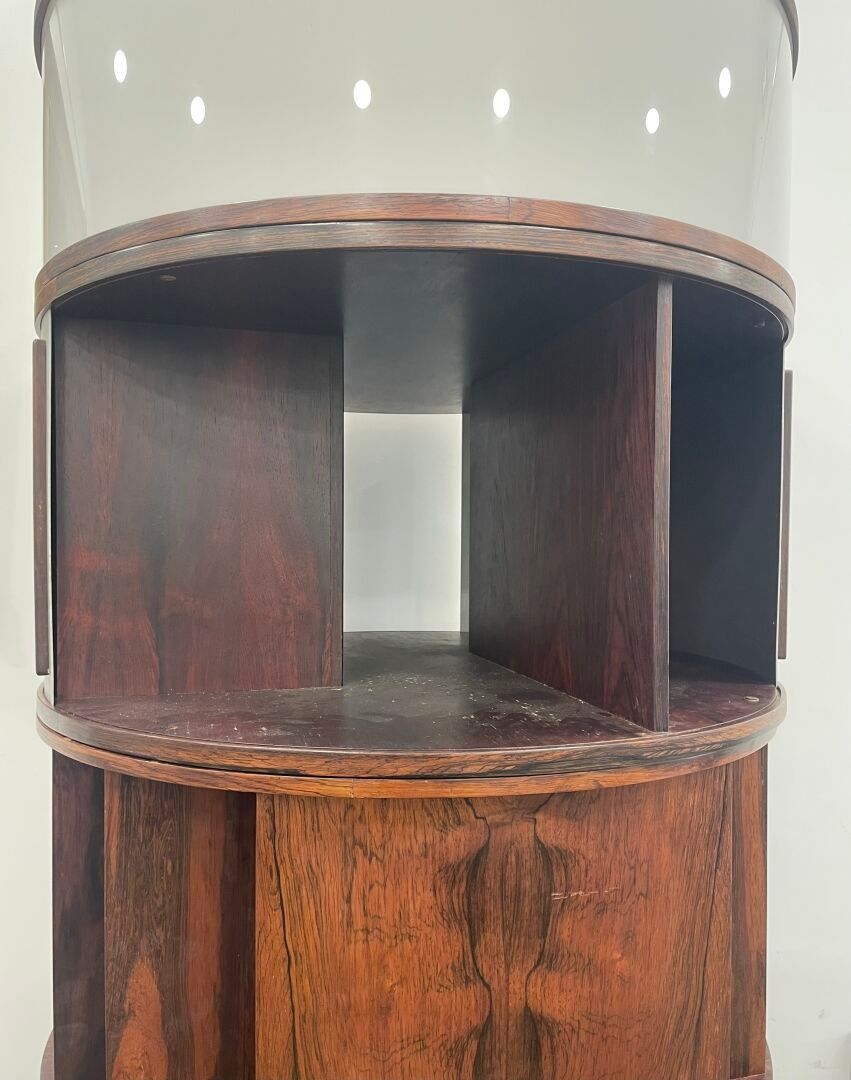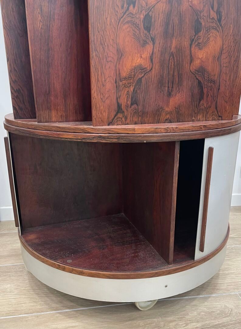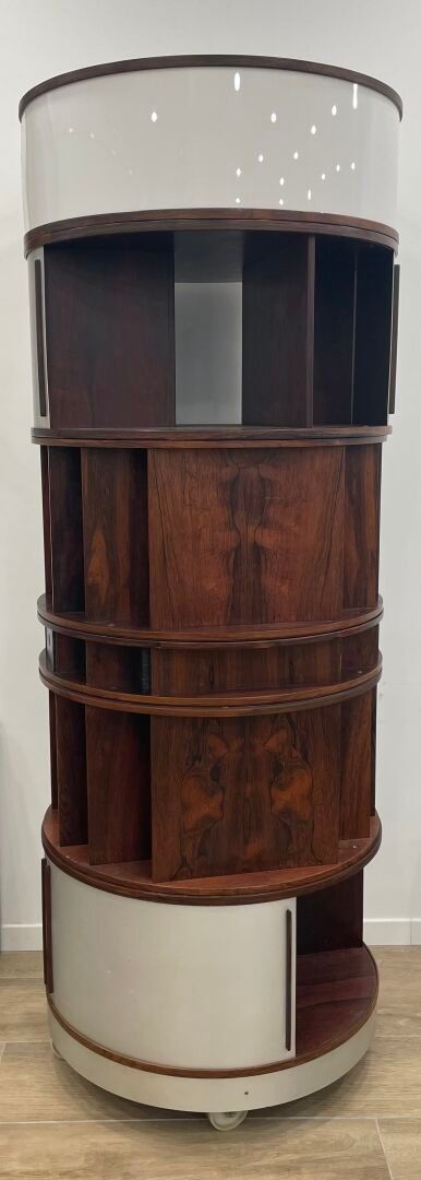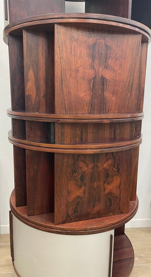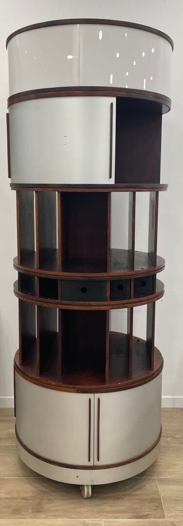 Combi-Center, Bernini publisher, Cylindrical storage unit in several superimposed parts opening with drawers and sliding doors, in rosewood veneer and brushed aluminium. It stands on castors.