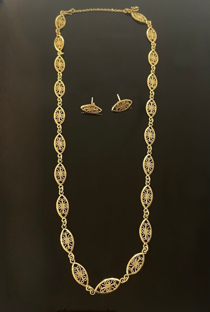 HALF SET in yellow gold (750) comprising a NECKLACE with filigree oval links and a pair of EARRINGS with the same decoration