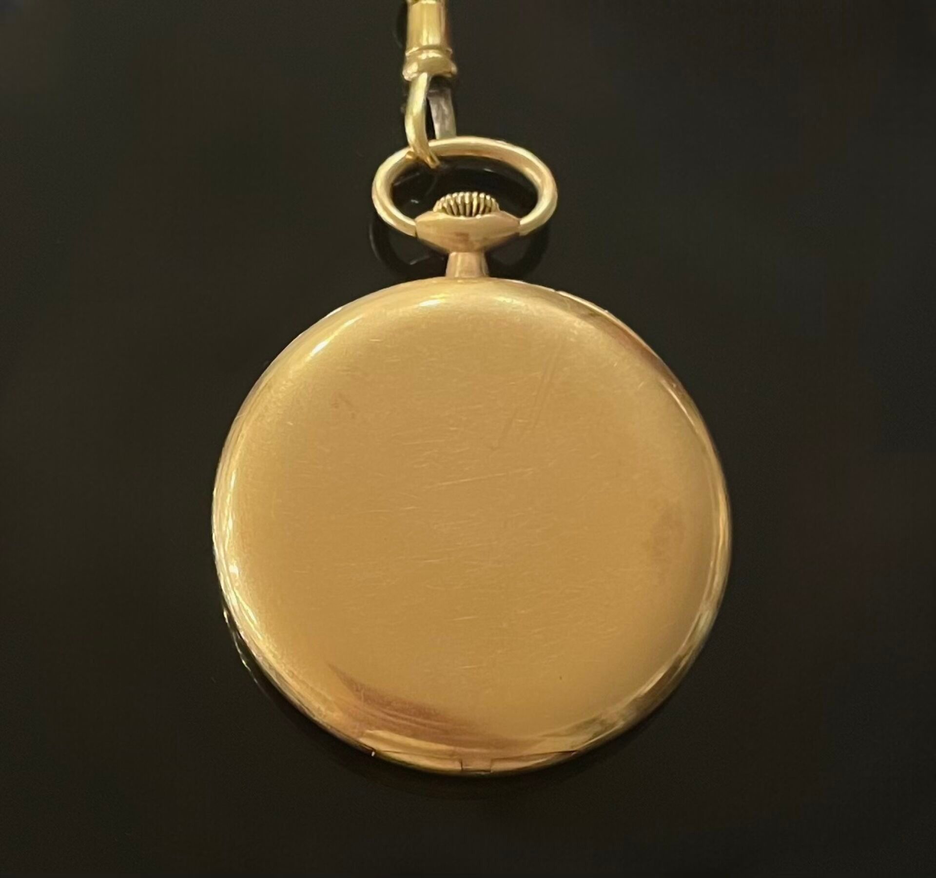 Yellow gold (750) pocket watch with olive chain. Gold guilloché dial with 2 zones. Blued steel Breguet hands. Breguet-style printed Arabic numerals, smooth back. Double bowl in gold (750).