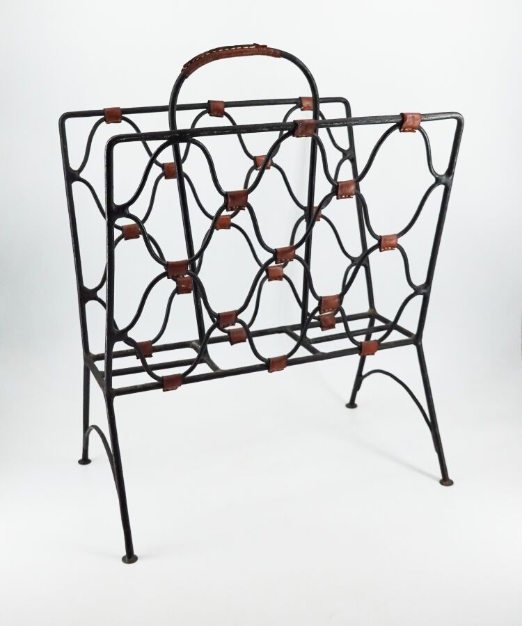 Magazine rack in the style of Jacques ADNET in metal with interlacing and leather decoration