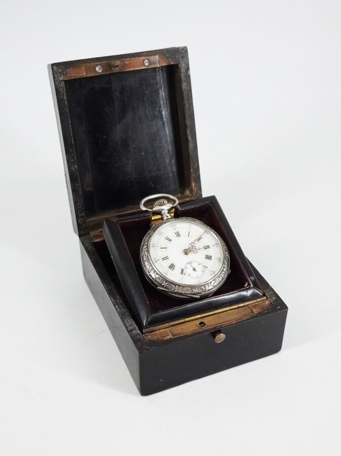 Blackened wood watch case with a silver gousset watch, Napoleon III period