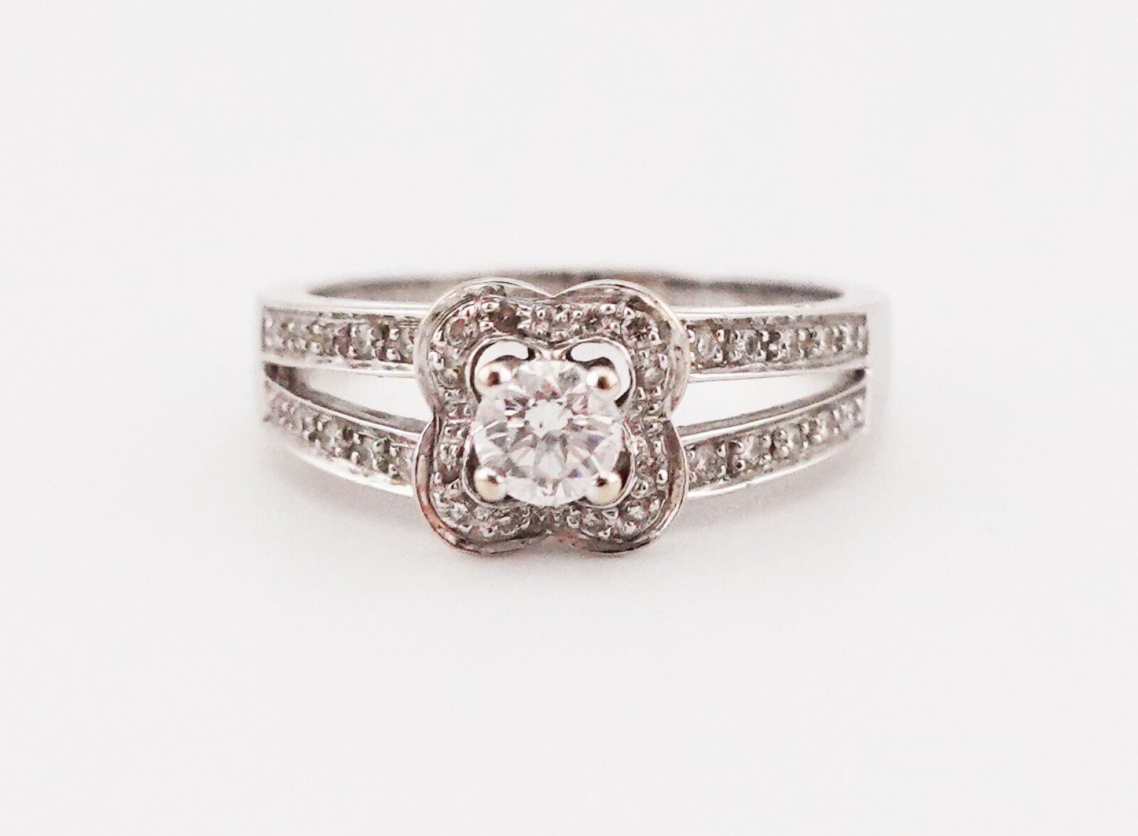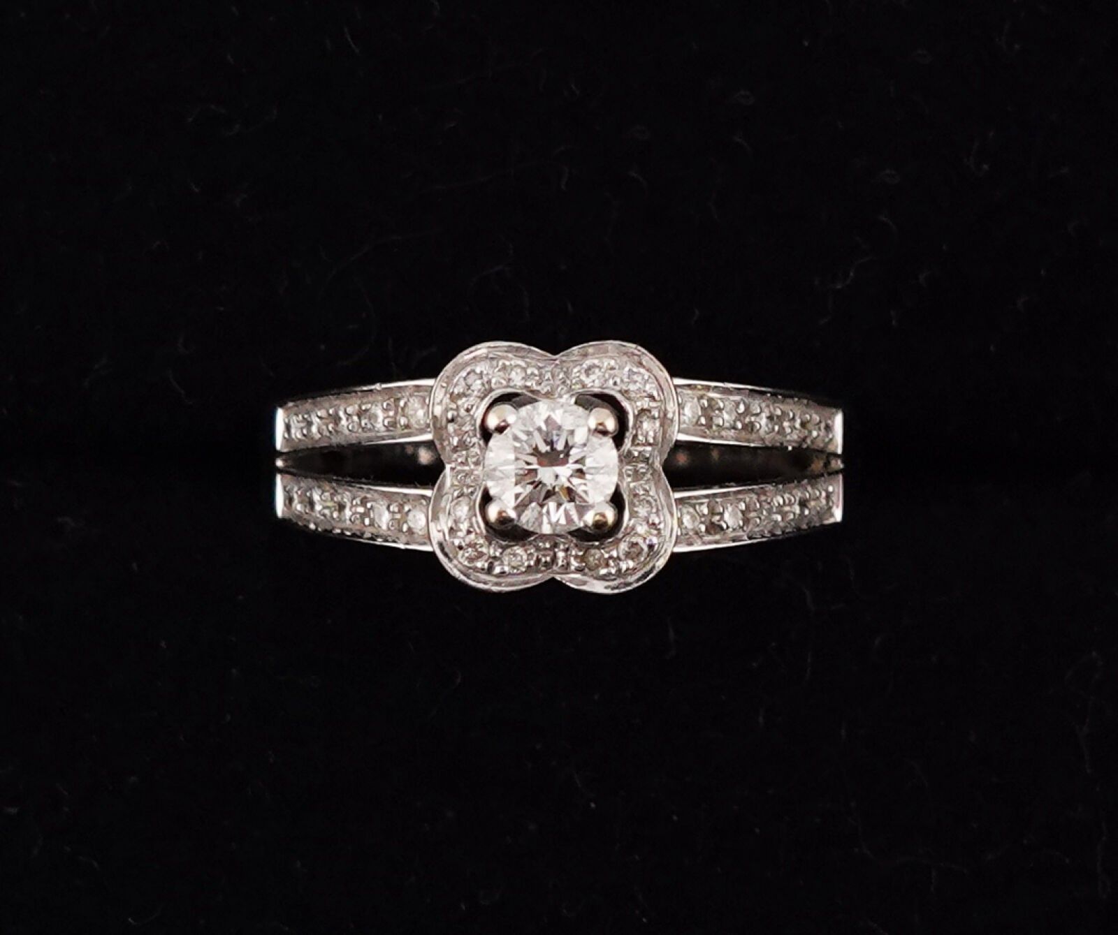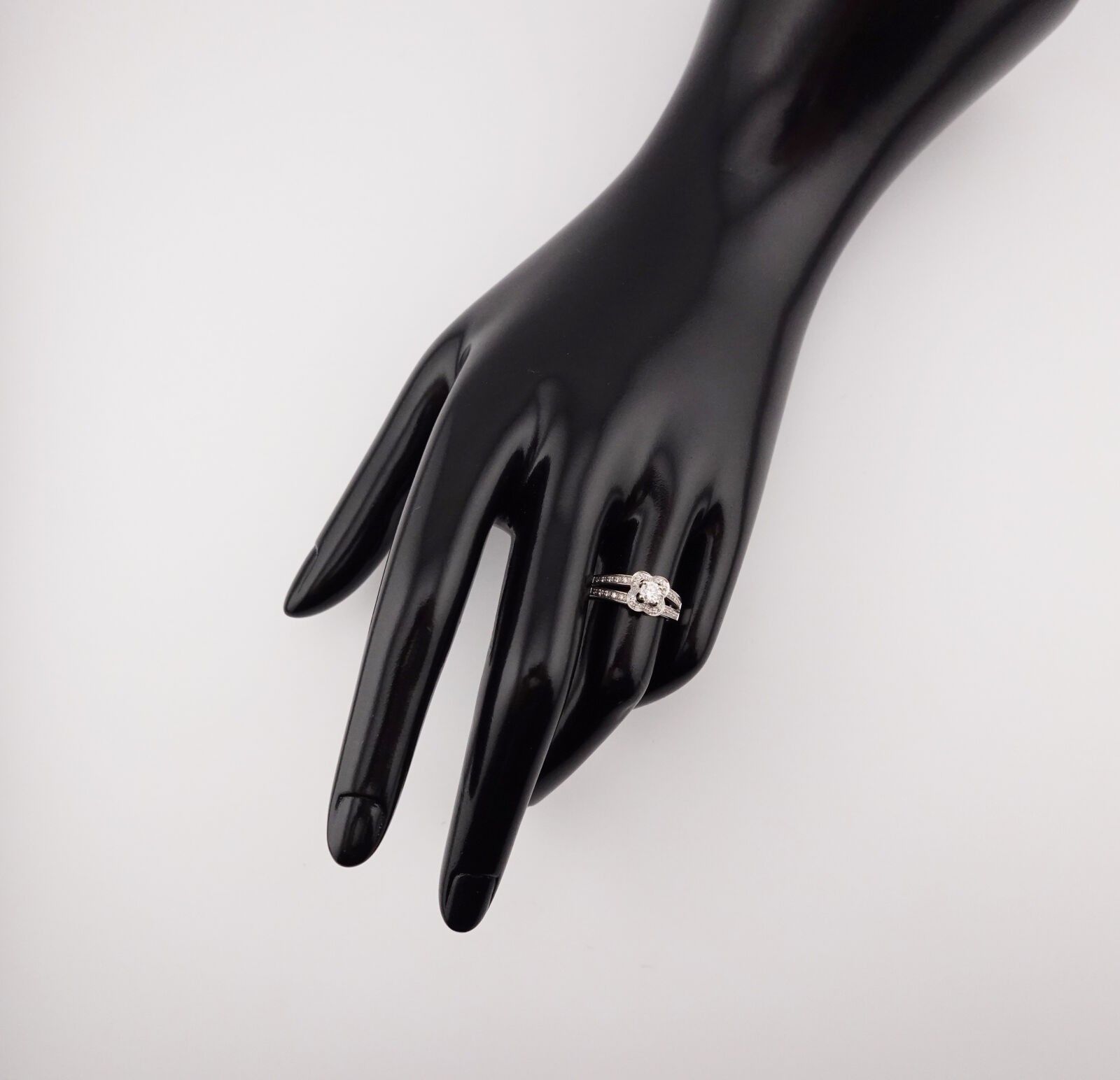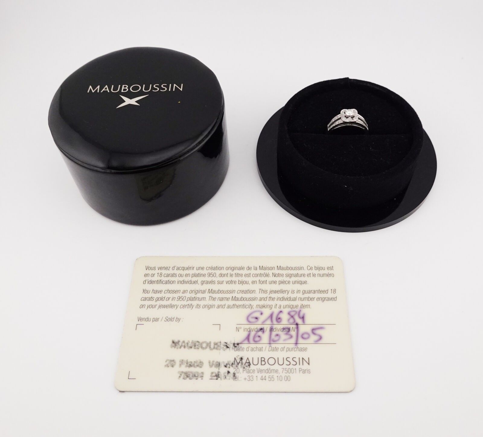 Chance of Love" ring centred on a diamond surrounded by diamonds and two rows of diamonds on the shoulder, with its case and certificate