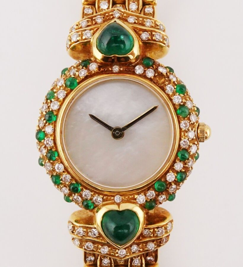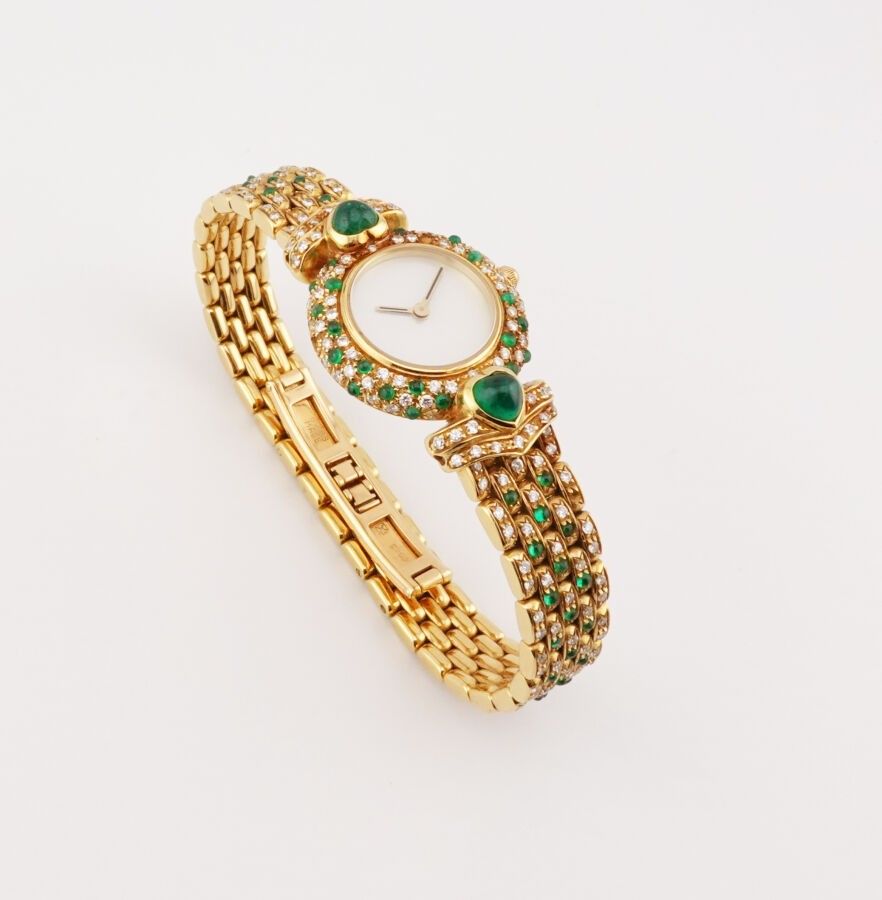 All-gold ladies' watch with round case in yellow gold set with diamonds and emeralds, mother-of-pearl dial, bracelet attachments set with heart-shaped cabochon emeralds, yellow gold bracelet set with diamonds and emeralds with folding clasp