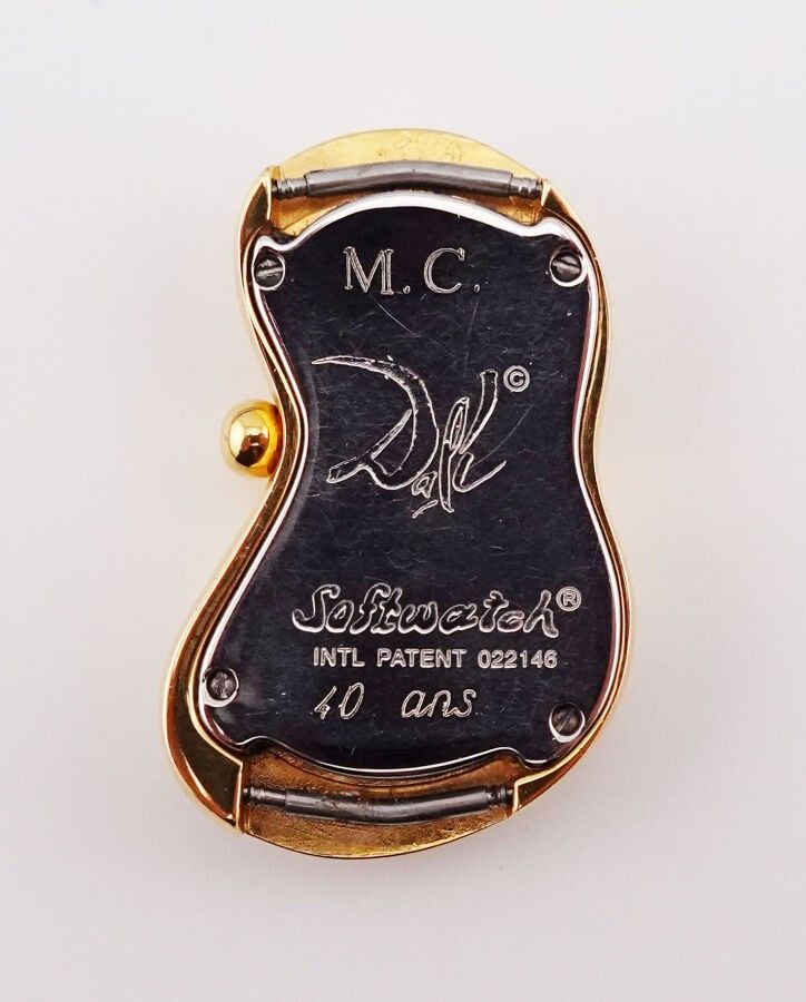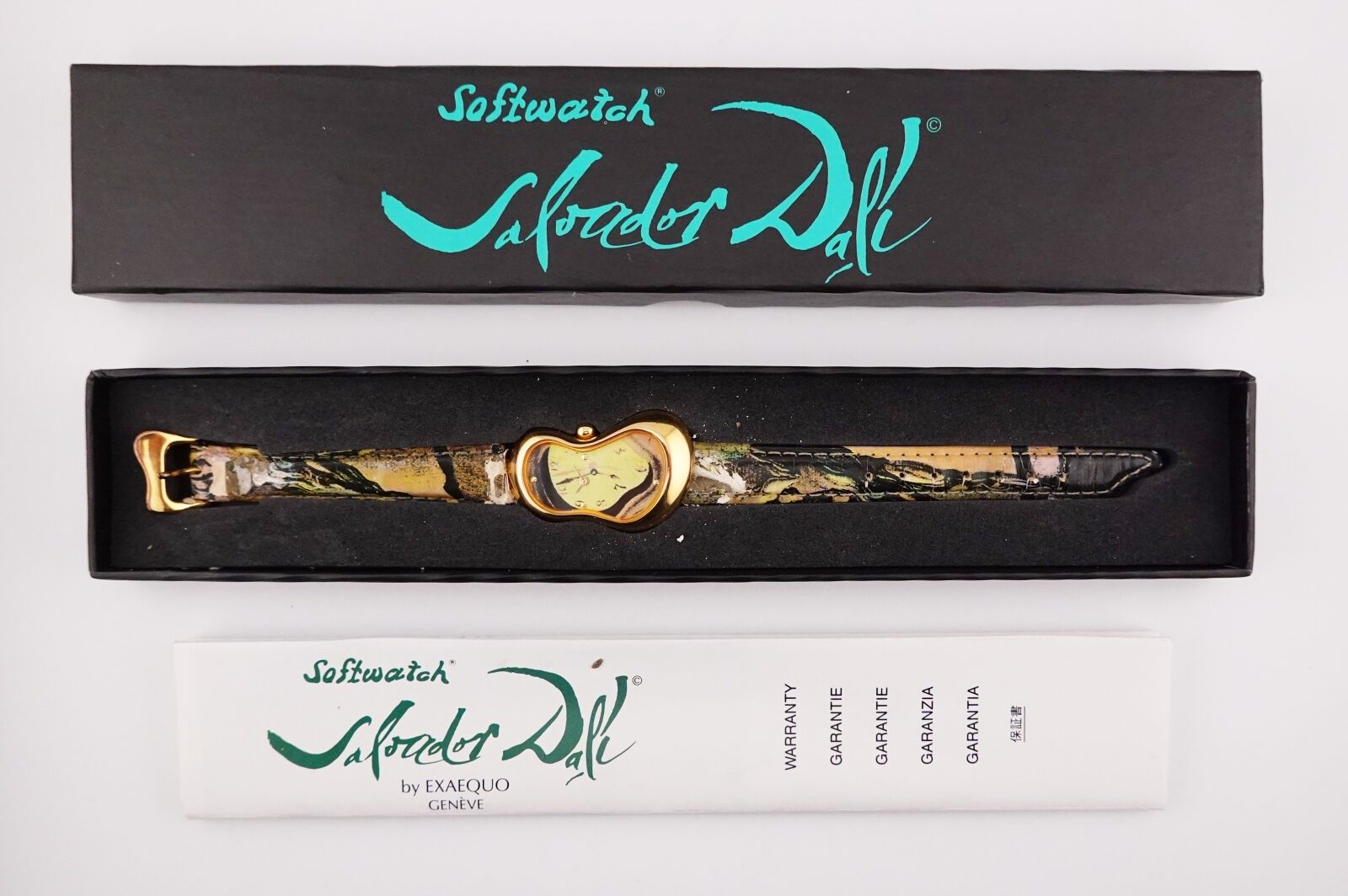 Softwatch Salvador Dali "40 ans" ref 022146, gold-plated steel case, with printed bracelet and pin buckle (bracelet broken), with its box and warranty.