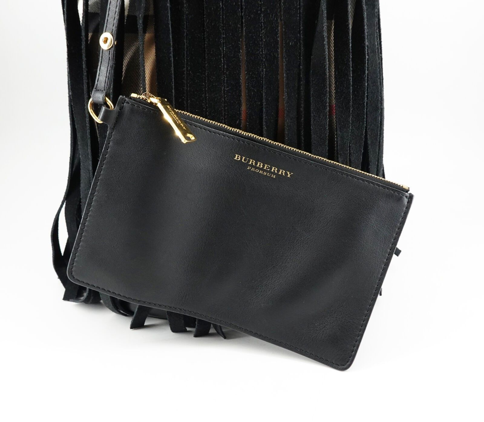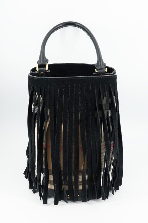 Prorsum collection bucket bag in canvas with tartan pattern and black leather fringes, with black leather inside pocket, with dustbag