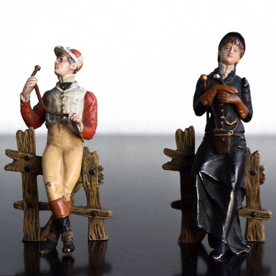 Set of two Vienna bronzes representing a jockey and a woman leaning against a fence, late 19th c.