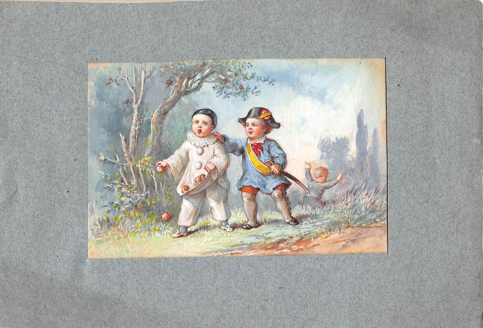 Advertising illustration project in gouache in advertising card format showing Pierrot and Harlequin disguised as Napoleon