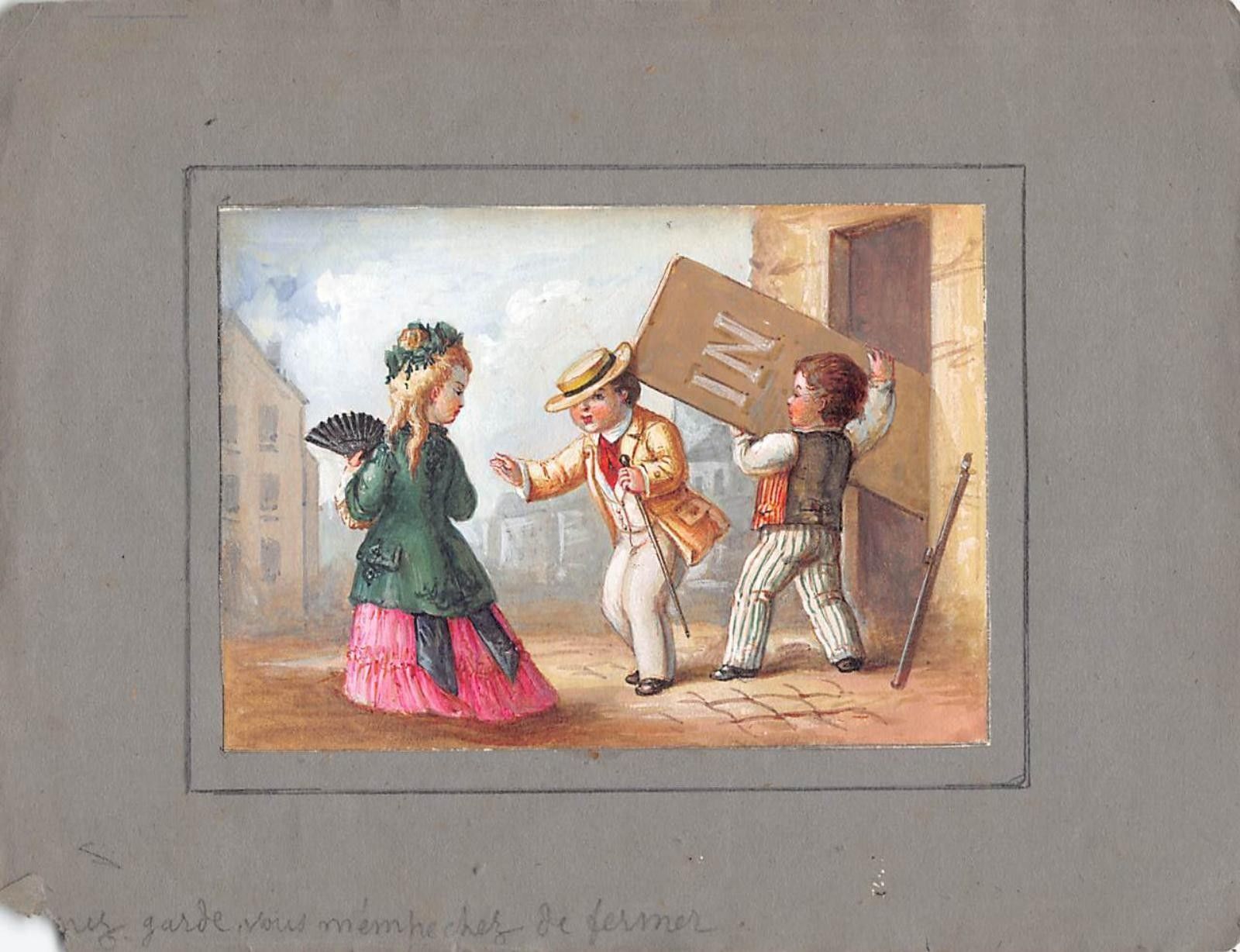 Advertising illustration project in gouache in advertising card format depicting "take care, you're stopping me from closing".