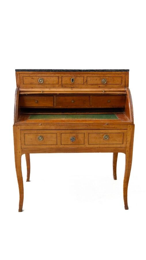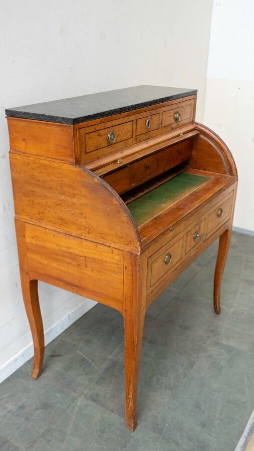 Transition style veneered cylinder desk opening with a stepped drawer, a drawer in the waist and a pull, marble top, 19th c.