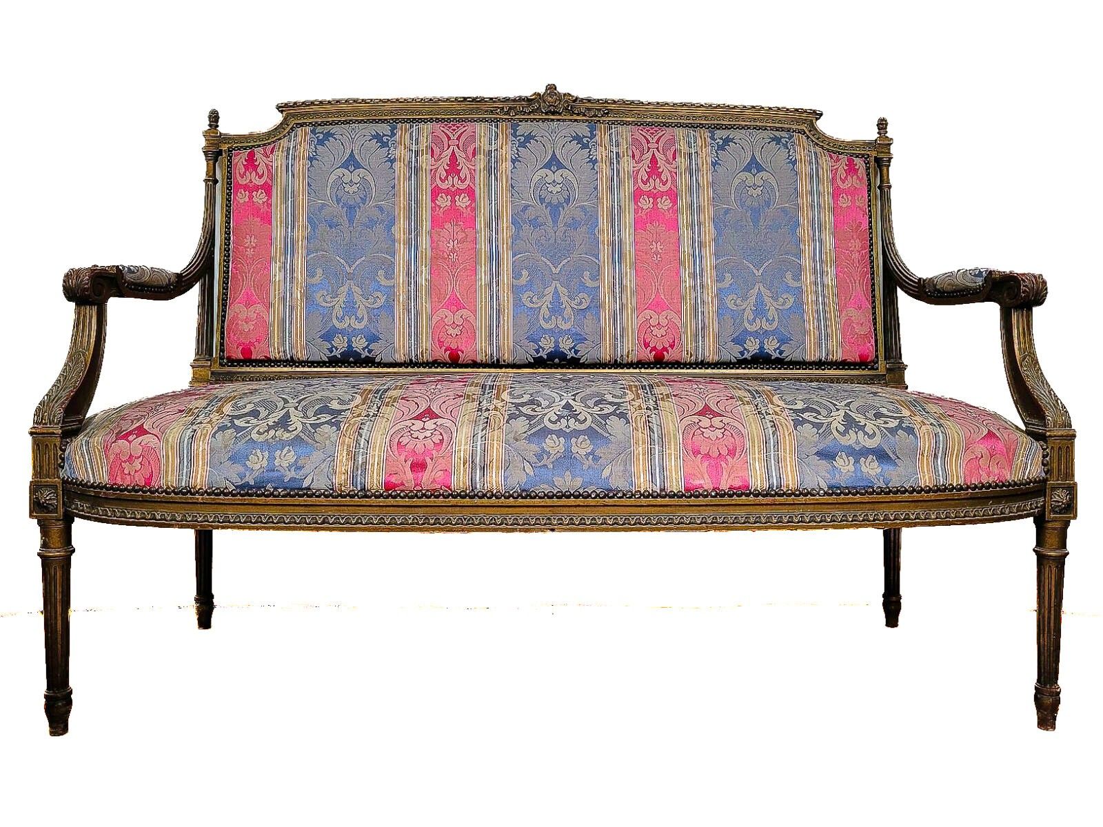 Louis XVI style bench in moulded and carved wood, blue and r…