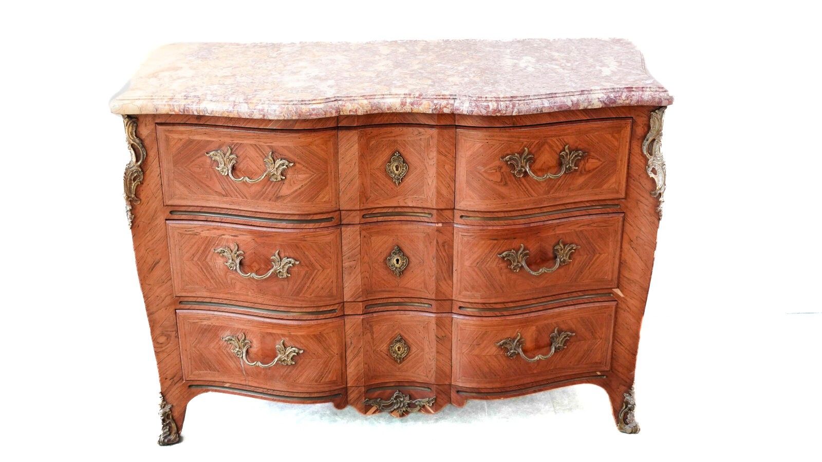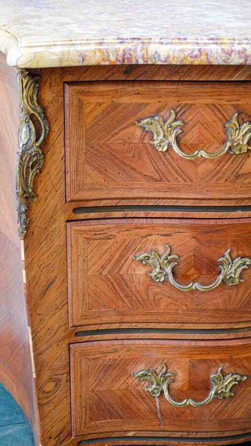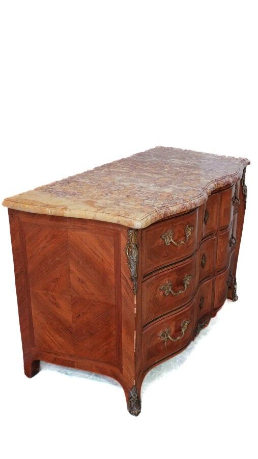A Regency style crossbow-fronted veneered chest of drawers opening with five drawers in three rows, gilt bronze trim and marble top.