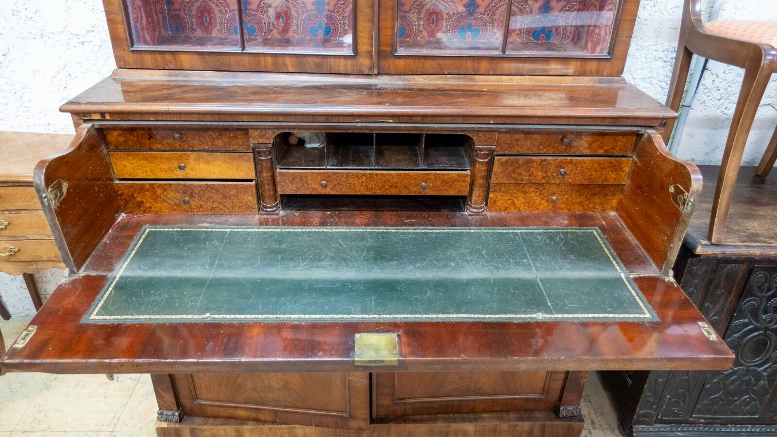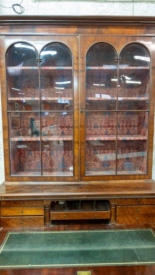 English two-piece veneered writing desk opening with two glass doors at the top, a pull-out desk and two doors at the bottom