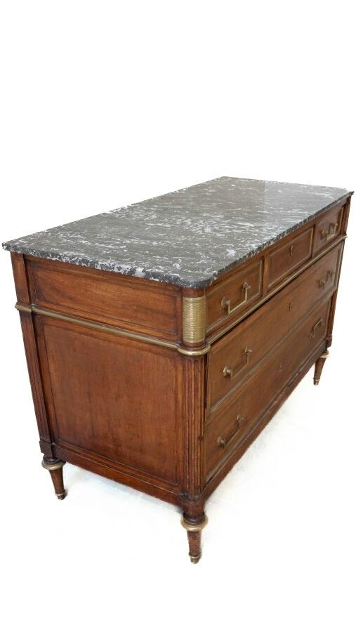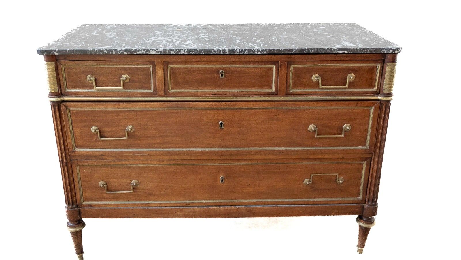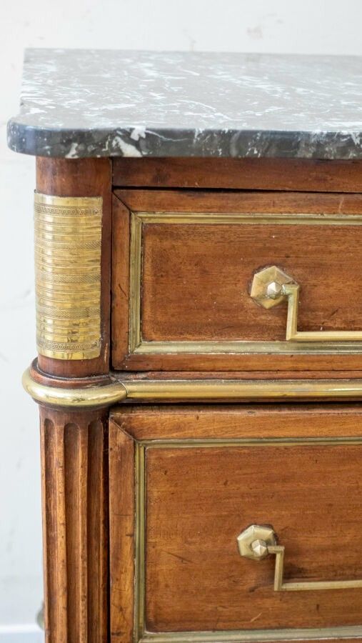 Louis XVI style mahogany veneered chest of drawers opening with five drawers in three rows, fluted column uprights, brass trim and marble top