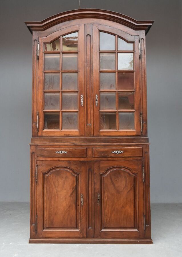 Large double bookcase in the Louis XVI style in mahogany, the upper part curved and opening with two glass doors, the lower part opening with two drawers and two doors.