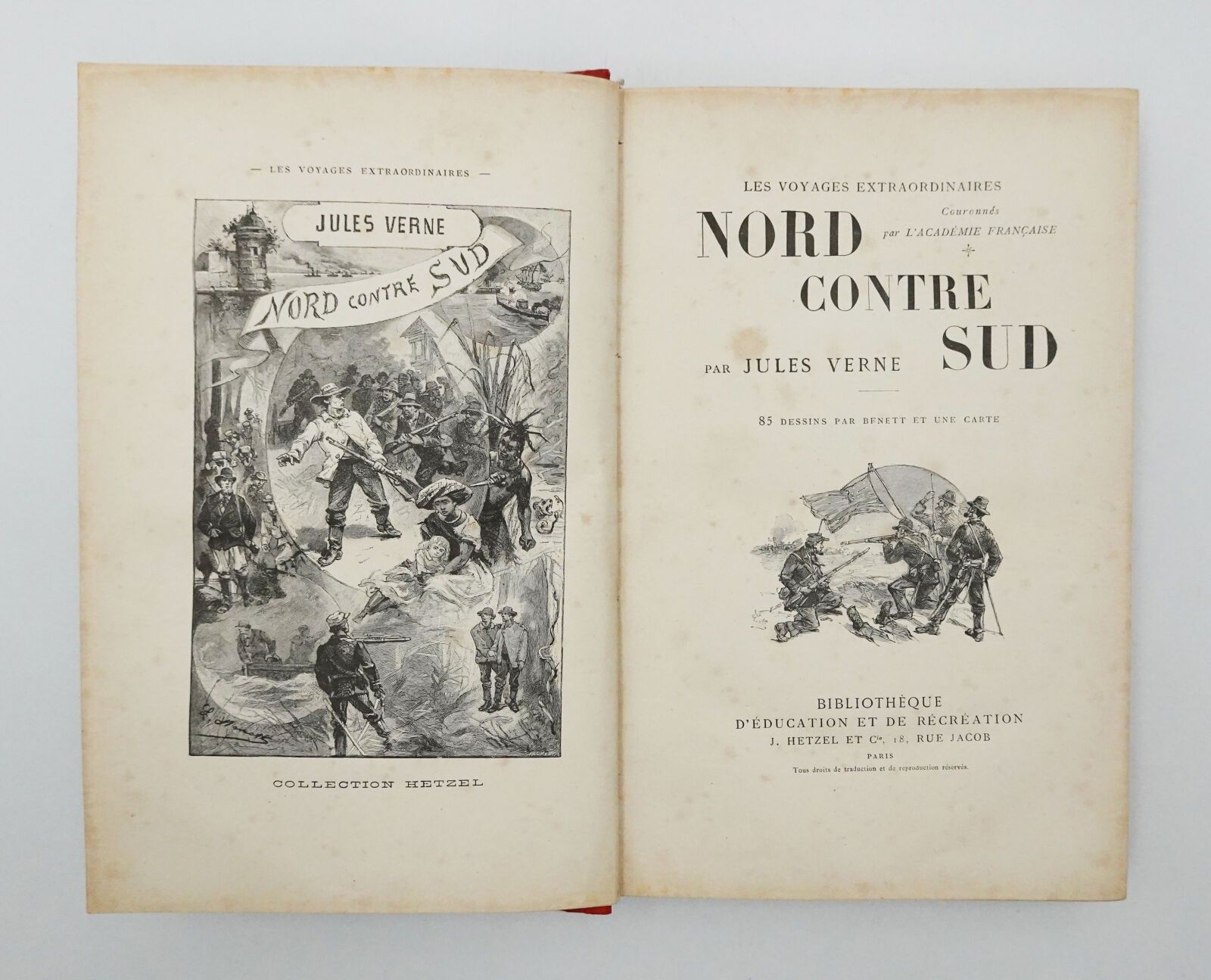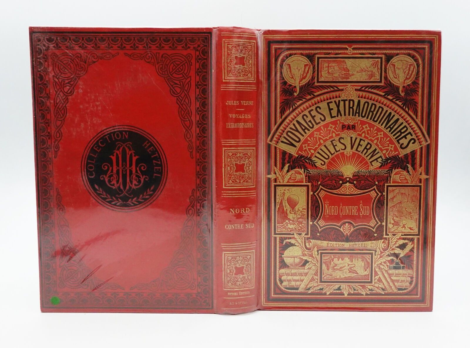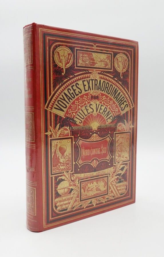 Jules VERNE. Extraordinary Voyages. North against South. HETZEL Collection Red publisher's percaline boards with two elephants (brown spots)