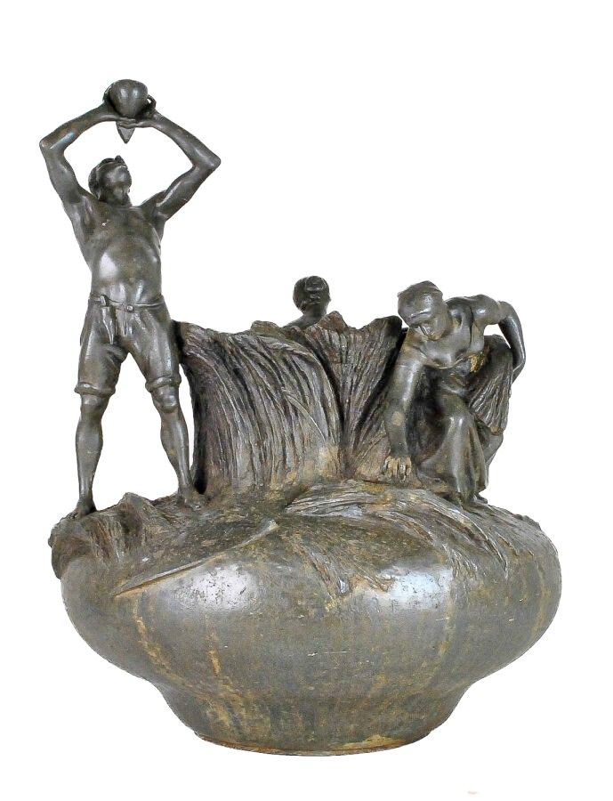 Large pewter vase with allegorical harvest decoration featuring a gleaner, a peasant drinking from his gourd and a mother breastfeeding her child in the round. Signed. Cast by SIOT-DECAUVILLE