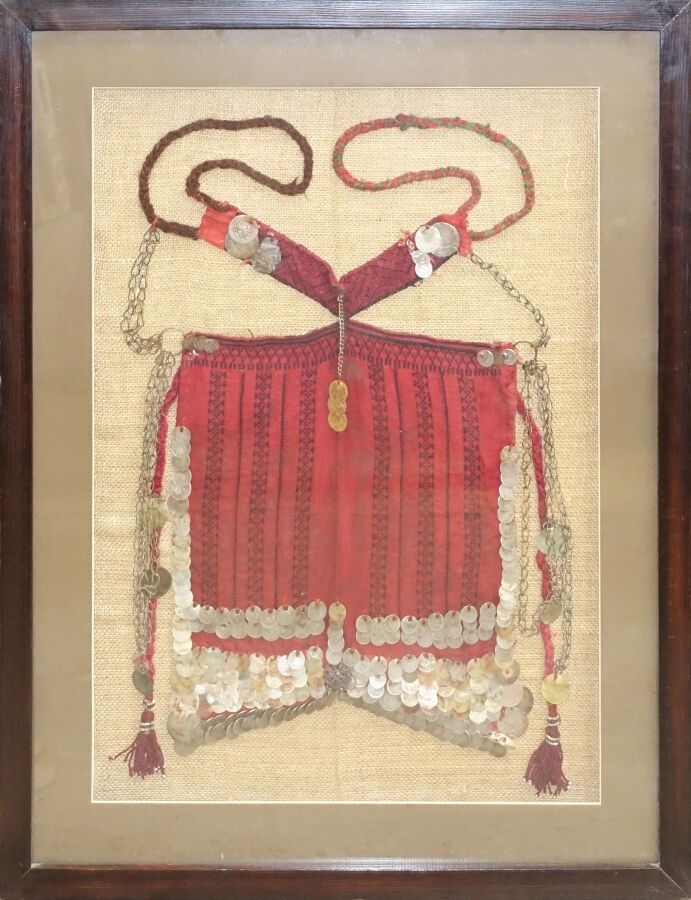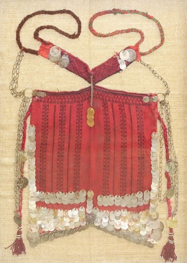 Red cloth veil embroidered with geometric frieze motifs and decorated with numerous coins, worn by Bedouin women outside the camp or in the presence of men from outside the family.