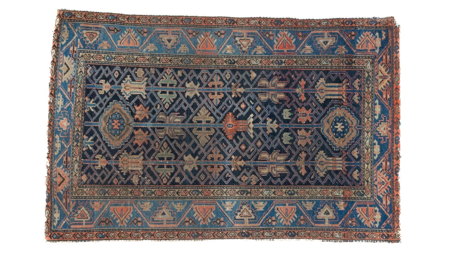 Persian Hamadan carpet with blue background and polychrome geometric motifs