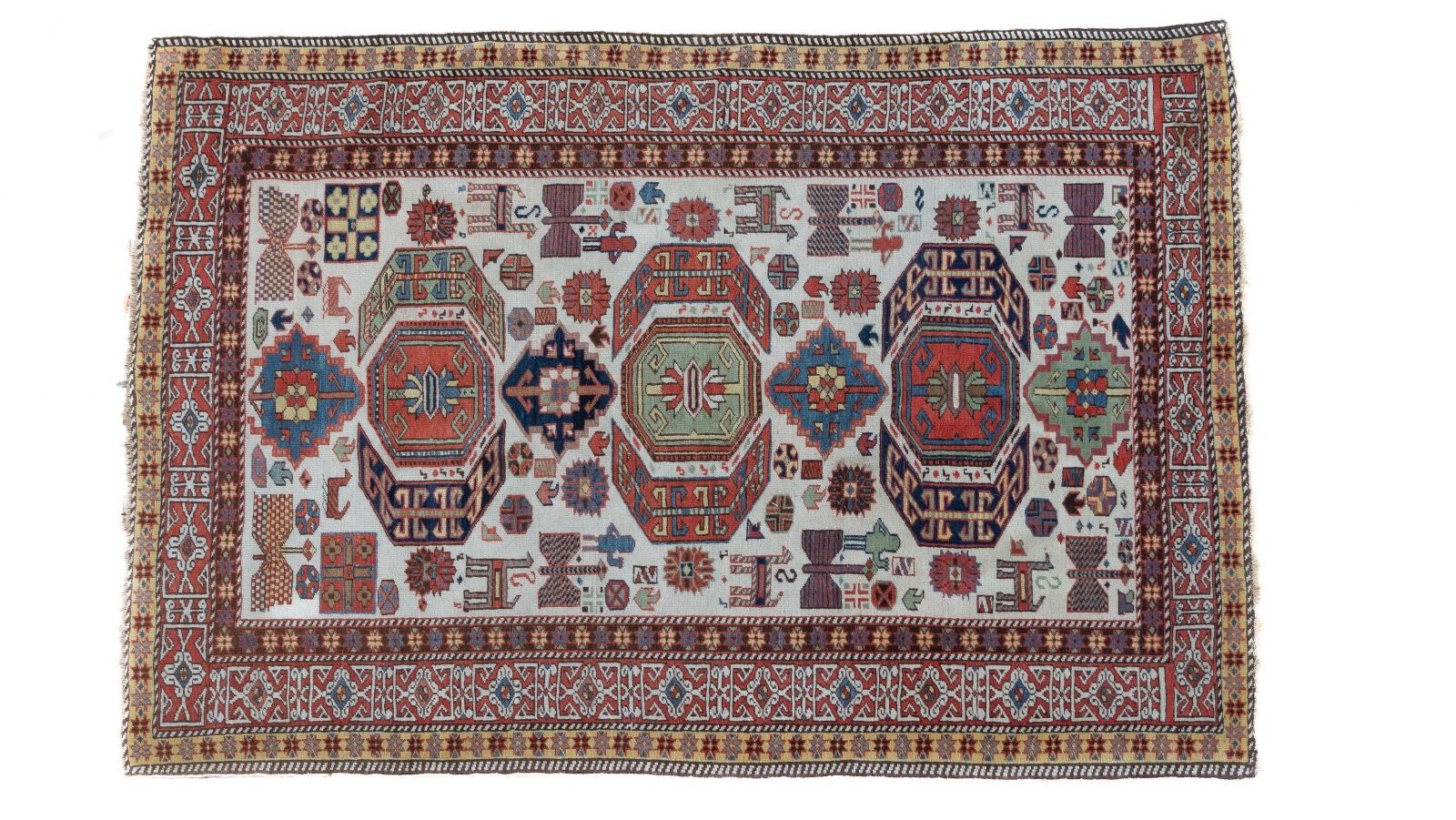Caucasus Chirvan carpet circa 1920 with ivory background and three medallions surrounded by animals and stylised figures