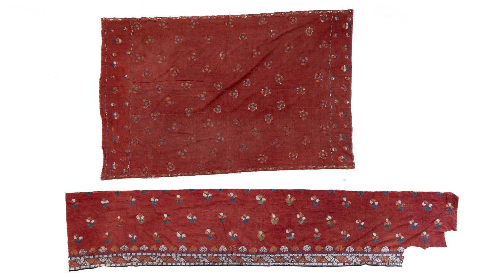 Two antique pieces of Indian textiles with a brick background, decorated with woven flowers and set mirrors