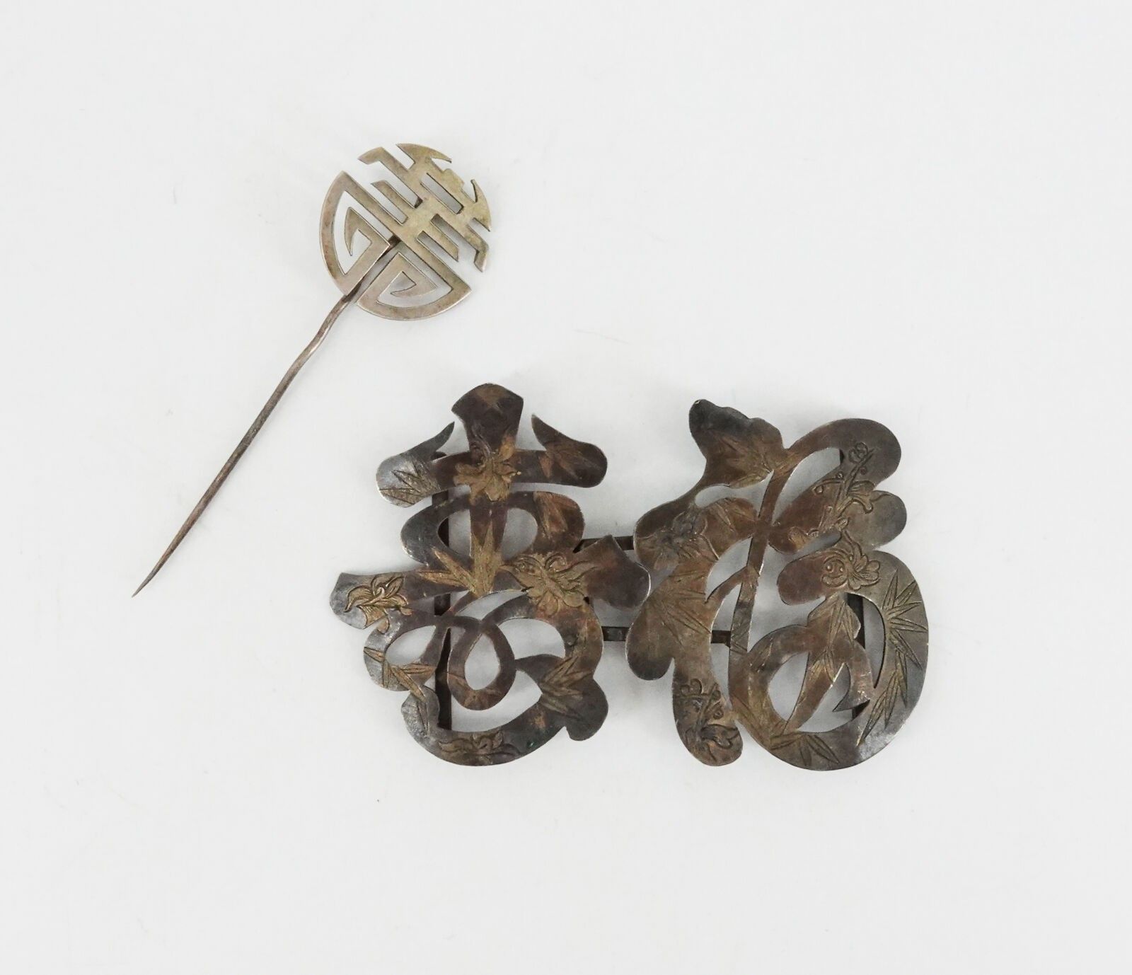 CHINA Silver Shu sign pin and calligraphy belt buckle