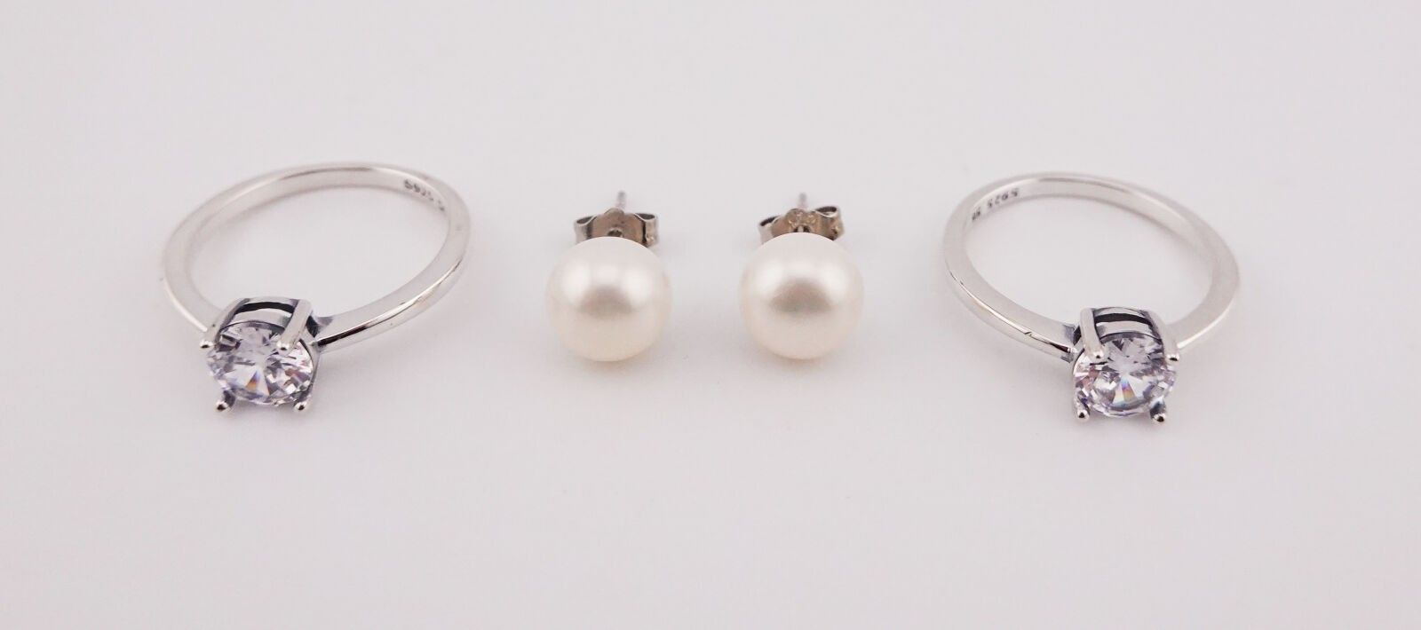 Lot consisting of a pair of earrings and two silver rings set with stones
