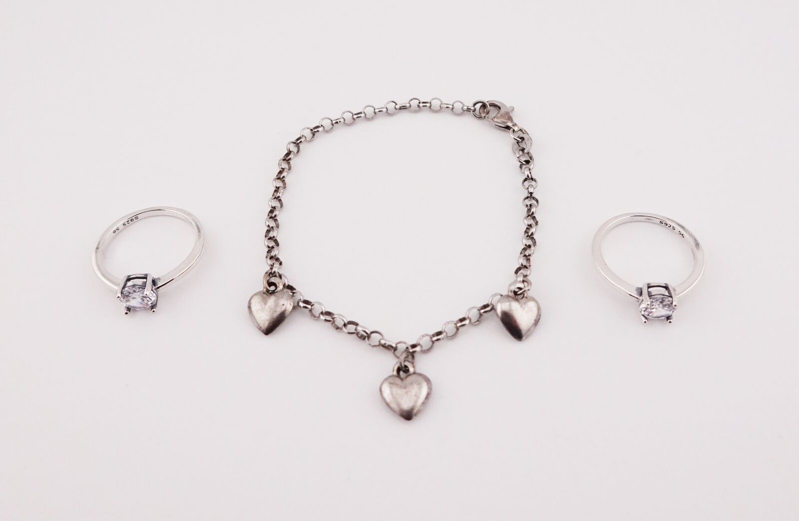 Lot consisting of a heart bracelet and two stone-set silver rings